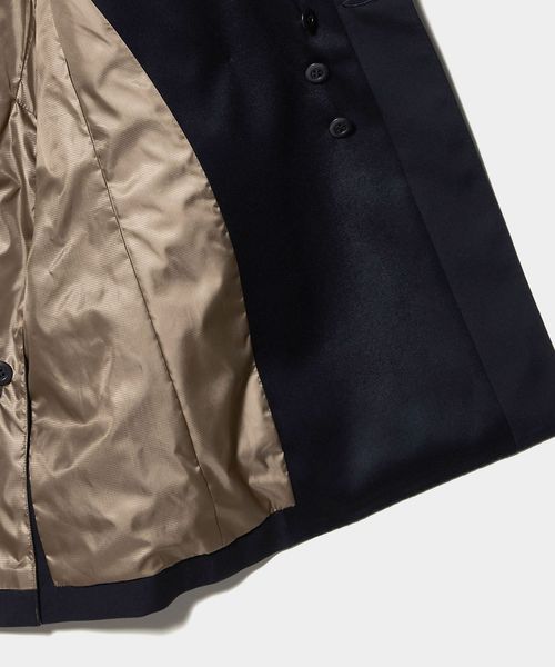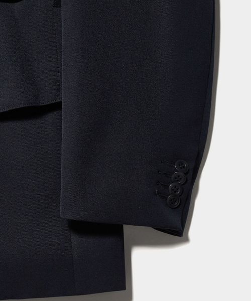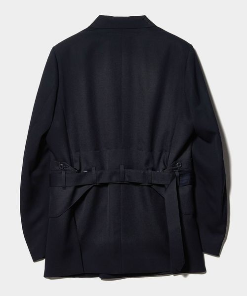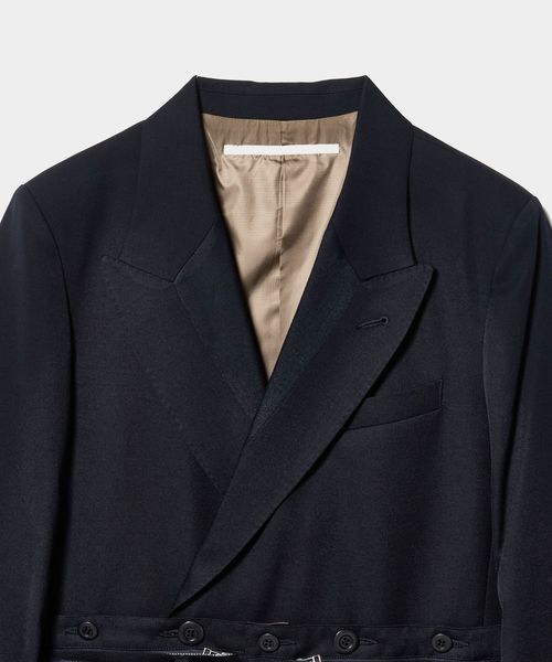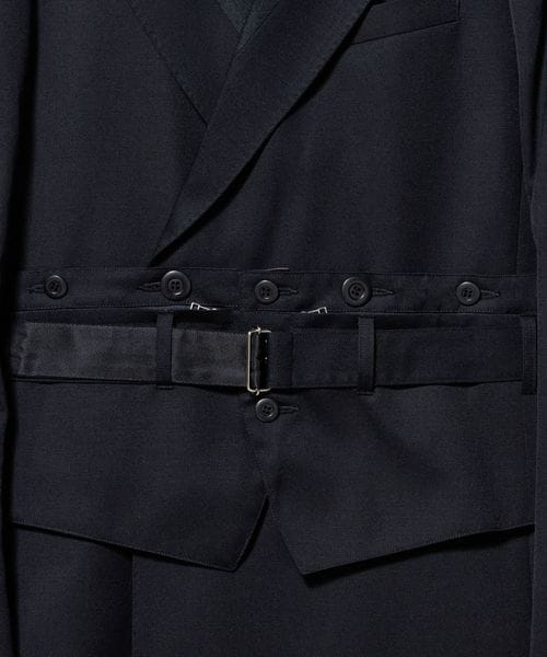 ピークドラペルというクラシカルな要素をベースとしつつも、ウエストにボタンやベルトをあしらうことで、<Tamme>らしいギミックを加えられています。
