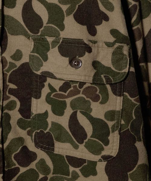 コットンフランネル生地を使用したカモフラージュ柄が印象的なシャツ。