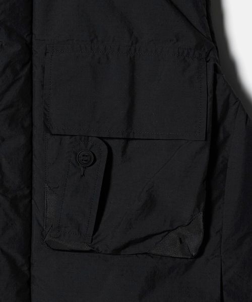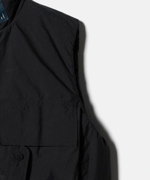 首周りの特徴的なリブ使いや、ナイロンテープを配したタブ付きポケットは、英国軍ボディーアーマーのディテールを追加。