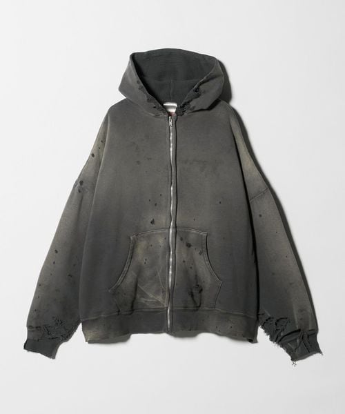 ダメージが施された風合いある表情のジップフーディ。