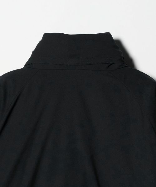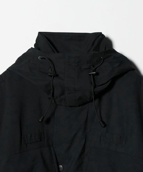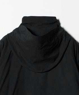 首元に収納可能なつば付きのフードは、顔まわりと後頭部にゴムスピンドルを配し、フィット感を調節可能。