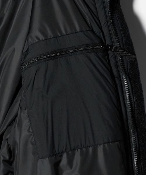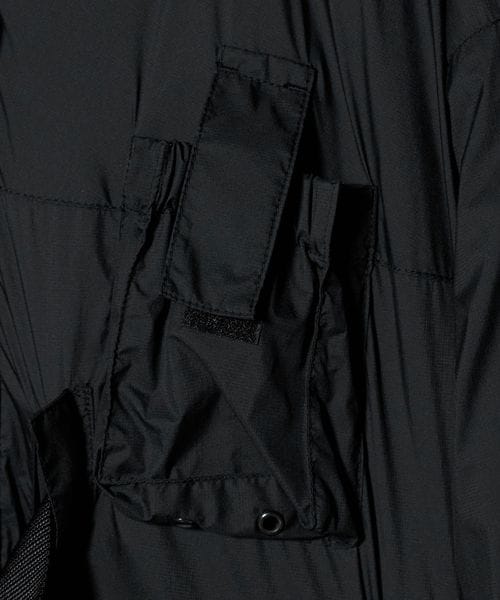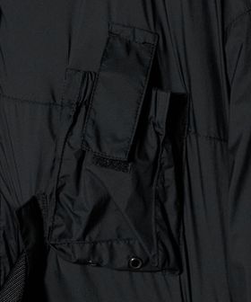 首元と袖口にはベルクロを配置、両サイドにはファスナーとベルクロ付きポケットを備え、内ポケットも完備。