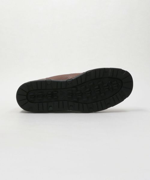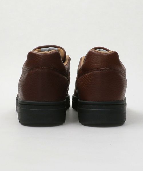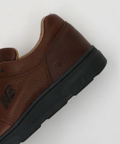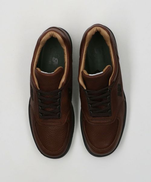 シボ感のあるレザーのアッパーにフライングNBロゴを刺繍。