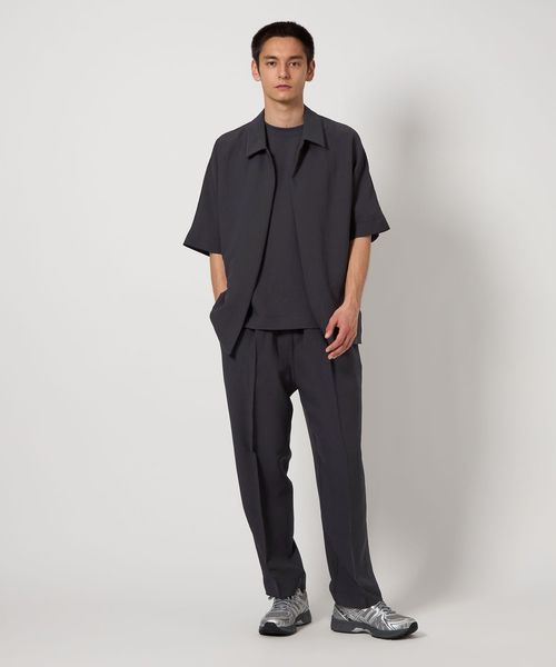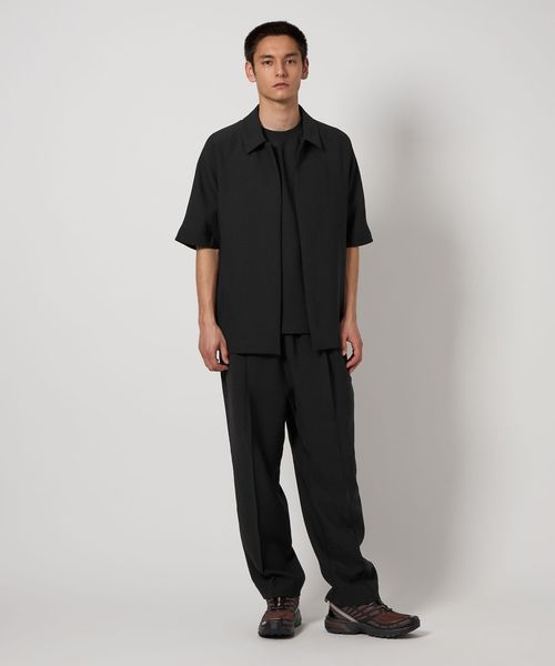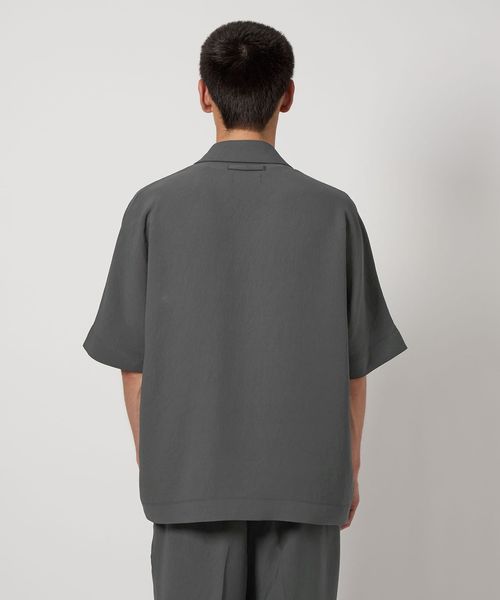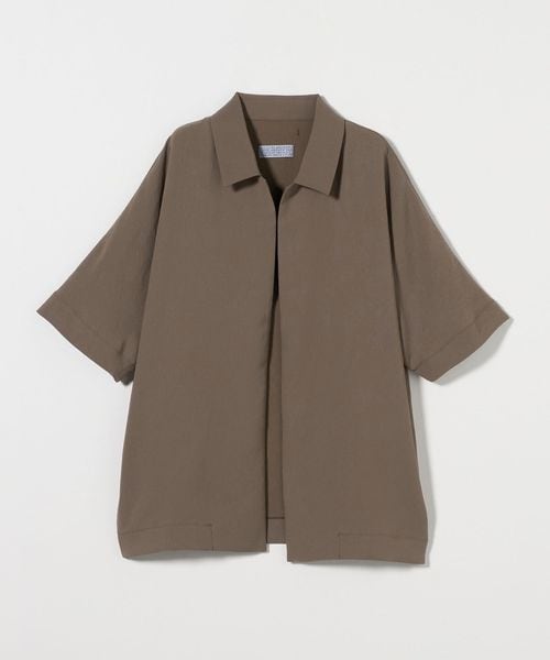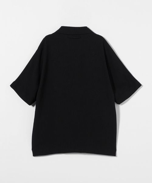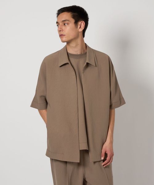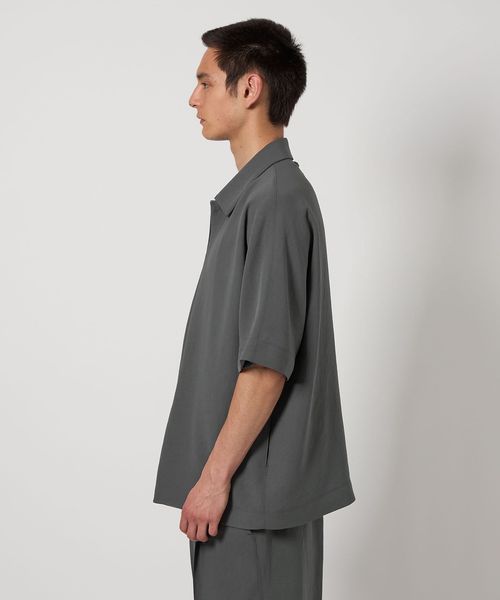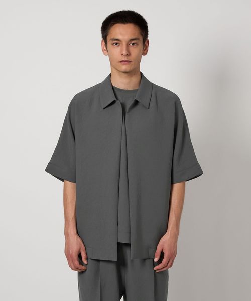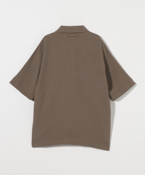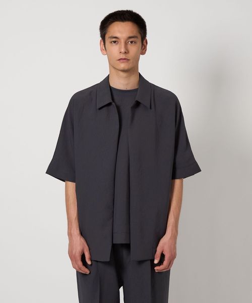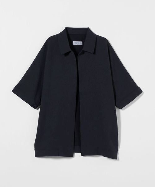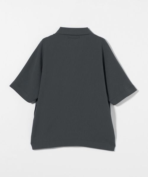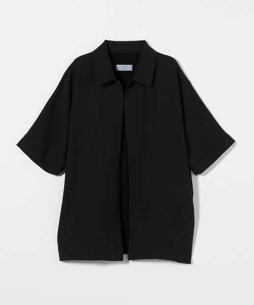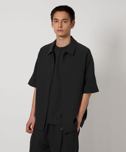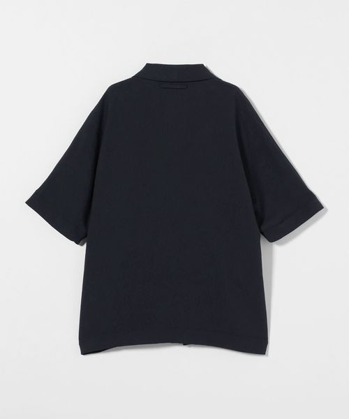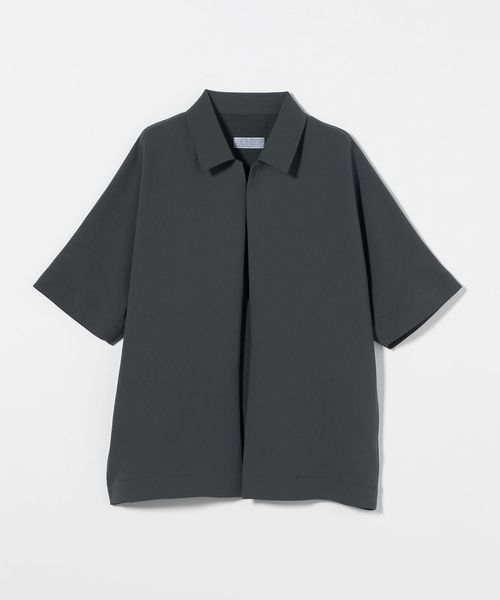 フロントボタンレスで衿の開き具合が特徴的なショートスリーブのコーチシャツ型。