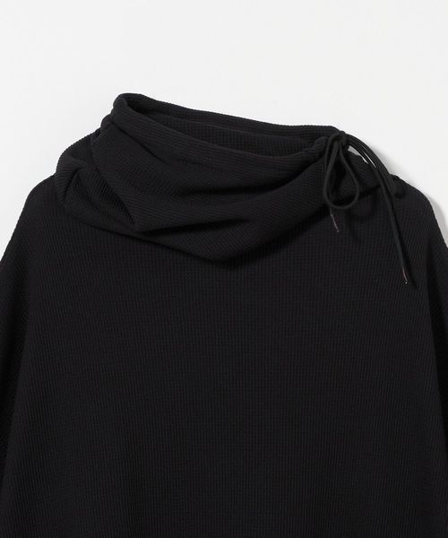 ネックのツイストドレープが効いたプルオーバーフーディ。