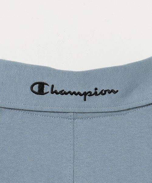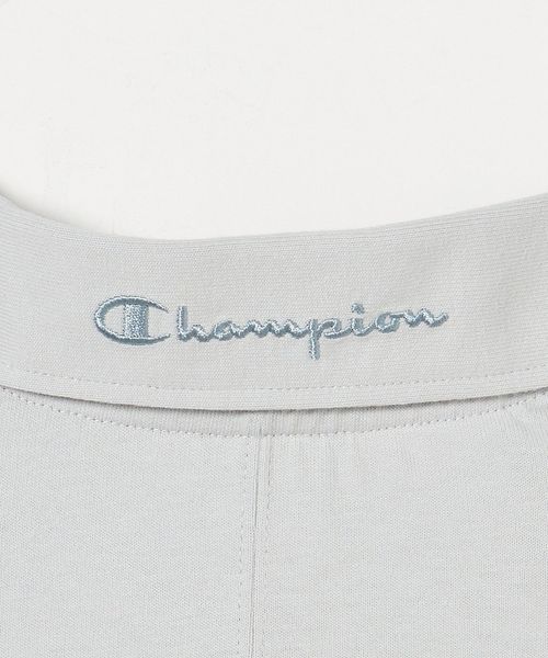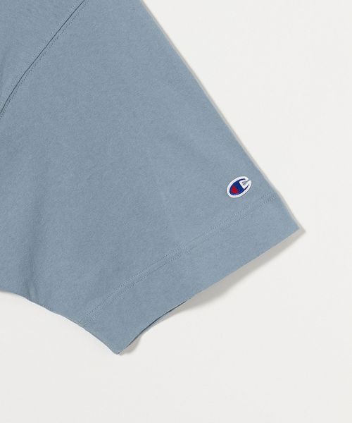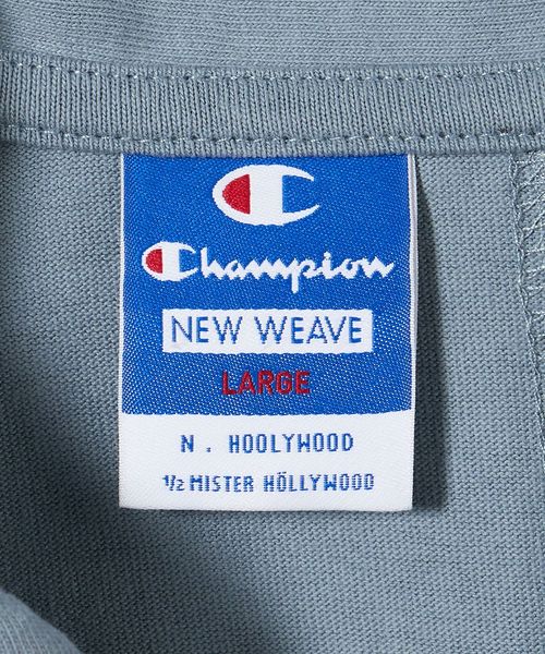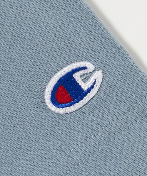 襟の背面にChampion のスクリプトロゴをエンブロイド、左袖にはチャンピオンの Cロゴワッペンを配置。