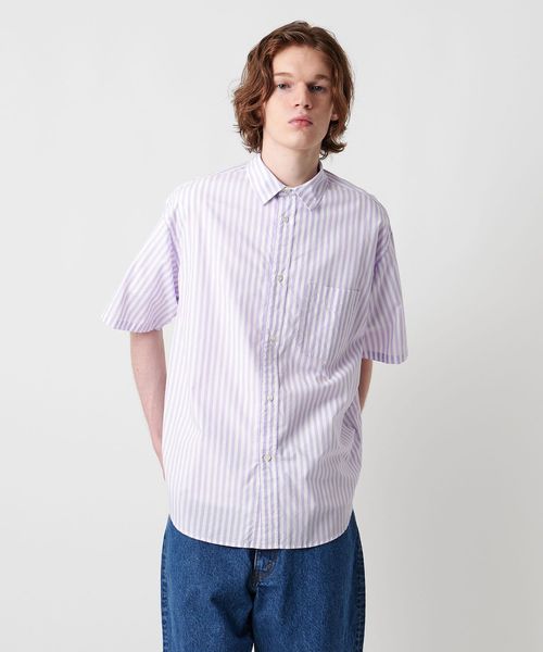 ロンドンストライプ柄が目を引くレギュラーカラーの半袖シャツ。