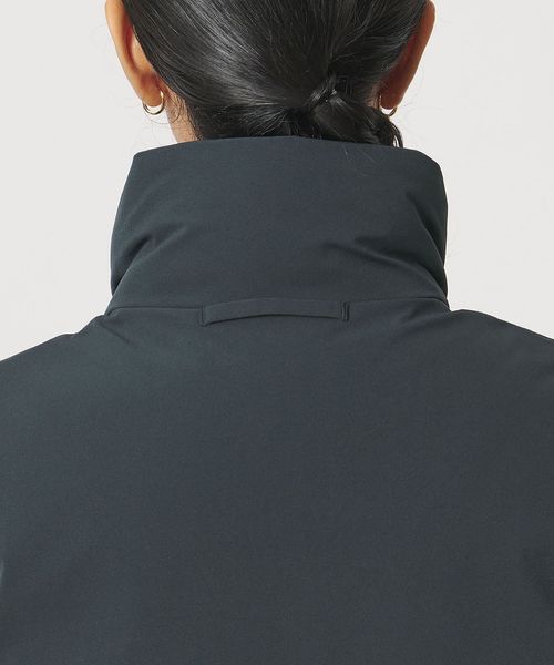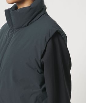 デザインと機能性を両立した、スタンドカラーのジップアップダウンベスト。