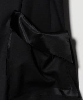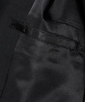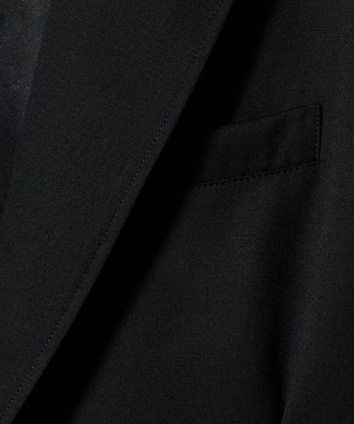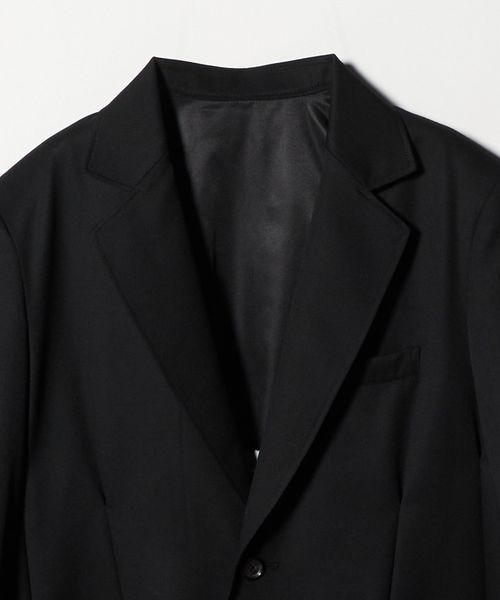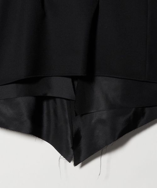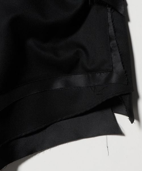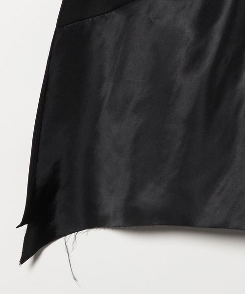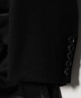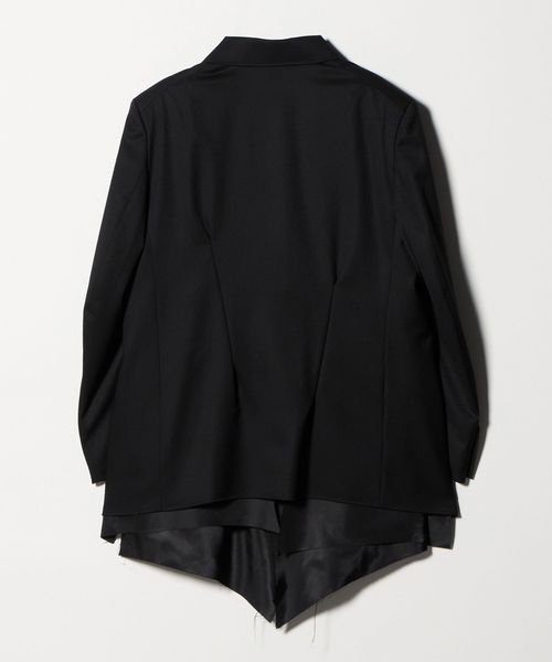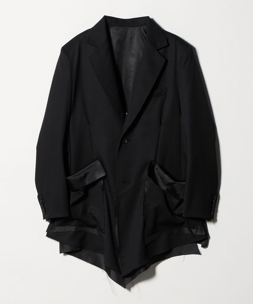 カットオフされた別地を配した、裾や袖口のアシンメトリーなデザインが特徴のジャケット。