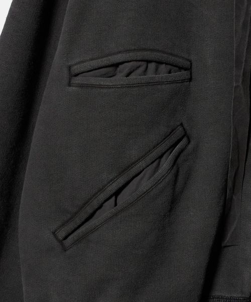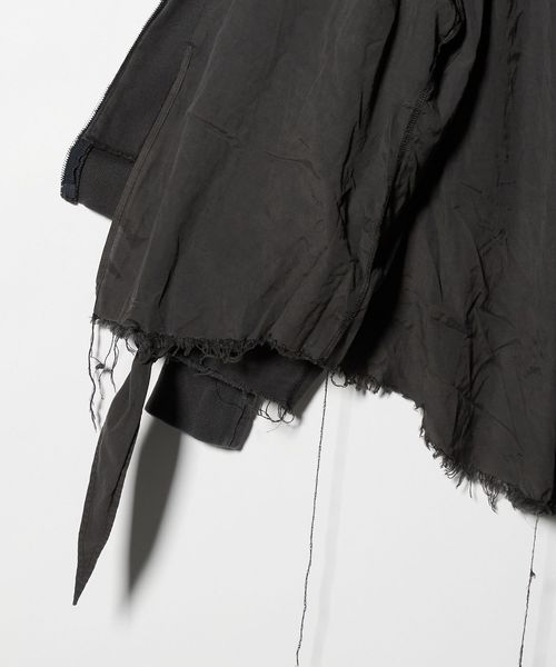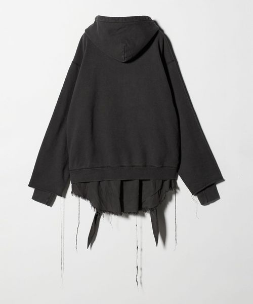 別生地をレイヤードした個性あふれるジップアップフーディ。