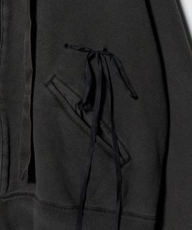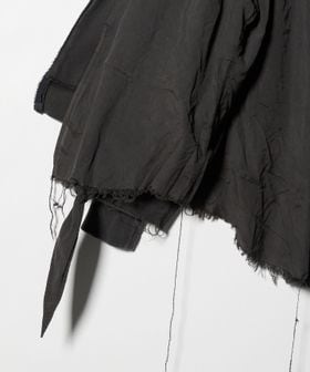 緑川氏のアーティザナルな思考を反映したウェアには、リボンテープや袖や裾からはみ出る生地といったデコラティブなディテールが施されている。