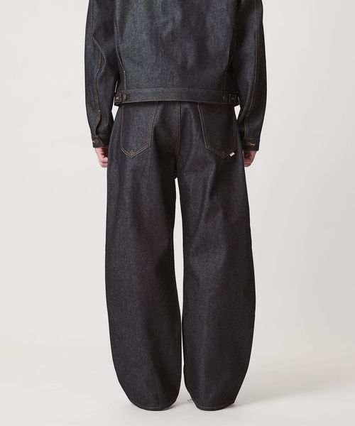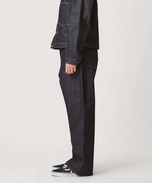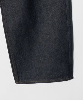 オーバーオールのウエスト位置から下を切り取ったような、深い股上とワタリから裾までたっぷりと分量を取った極太のストレートシルエット。