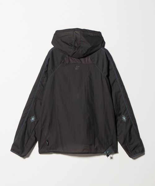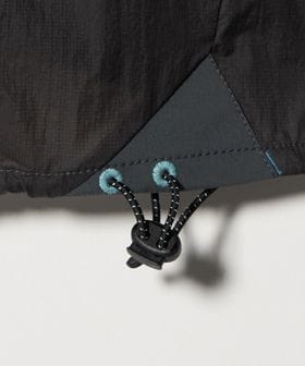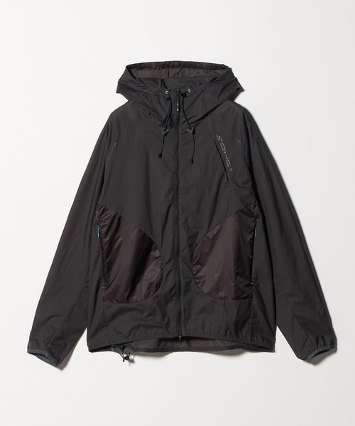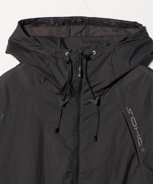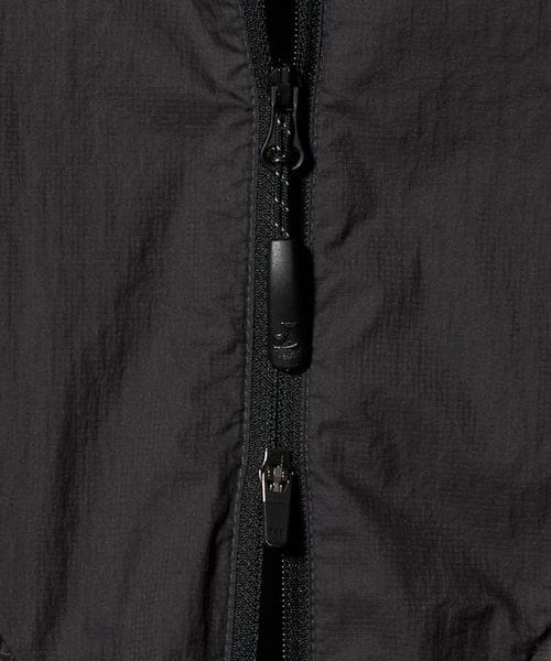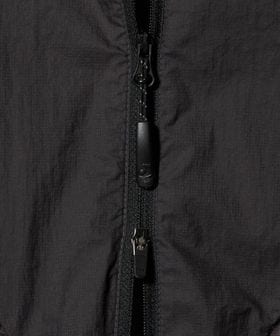 軽い薄手のナイロン生地を使用したジップアップフーディージャケット。