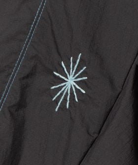背面の肘周りには刺繍のワンポイント、ステッチワークなどブルーカラーのアクセントがあしらわれています。