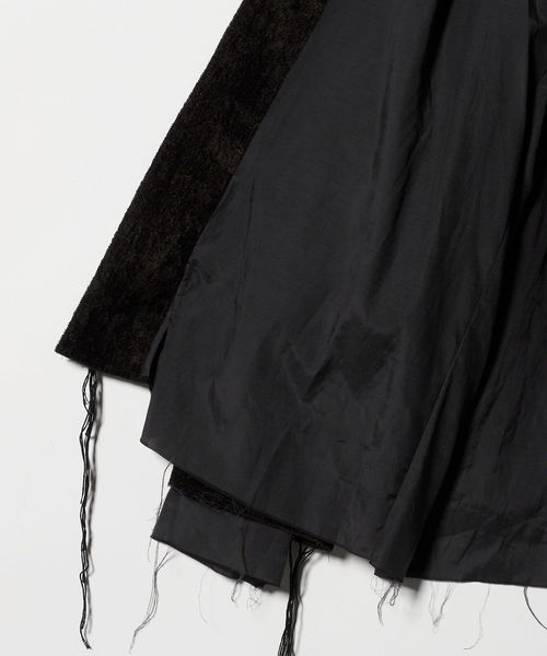 緑川氏のアーティザナルな思考を反映したウェアには、リボンテープや袖や裾からはみ出る生地といったデコラティブなディテールが施されている。
