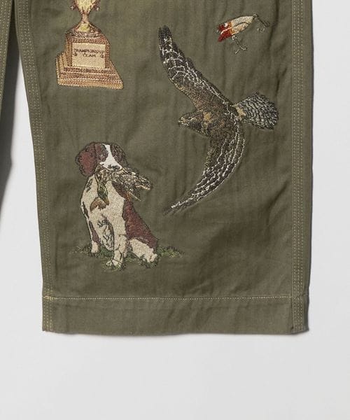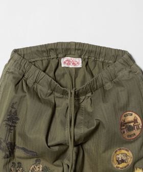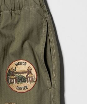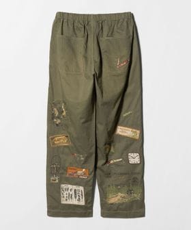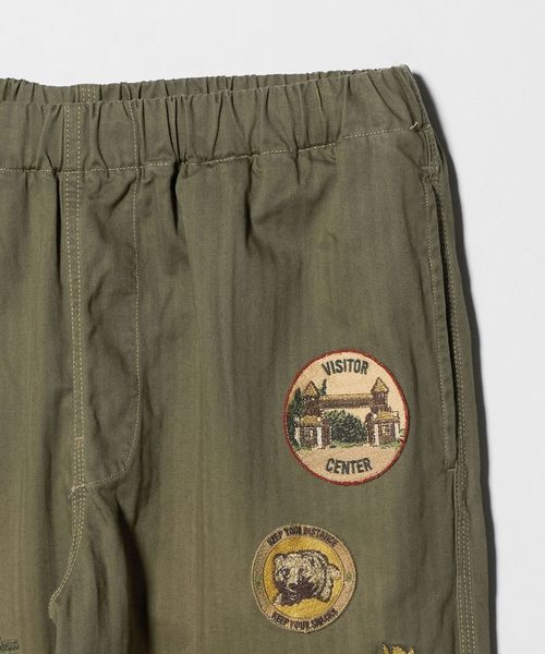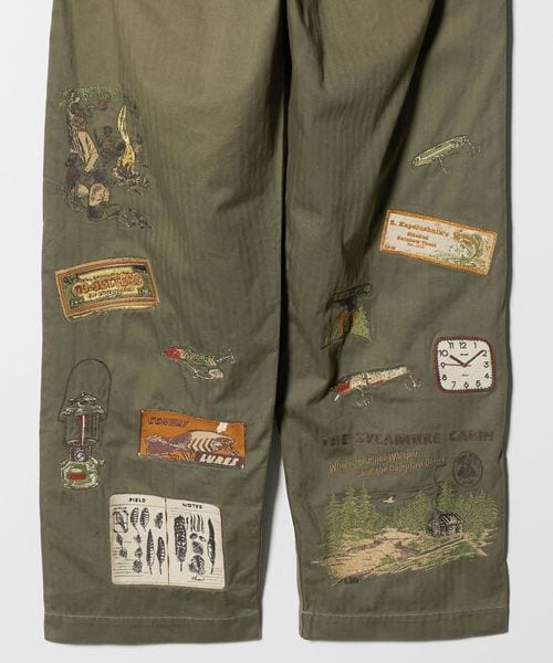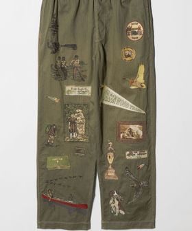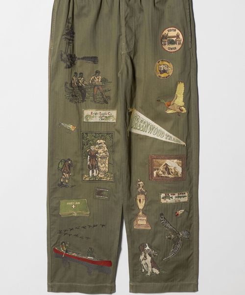 オリジナルグラフィックの刺繍やワッペンを贅沢に配したトレイルパンツ。