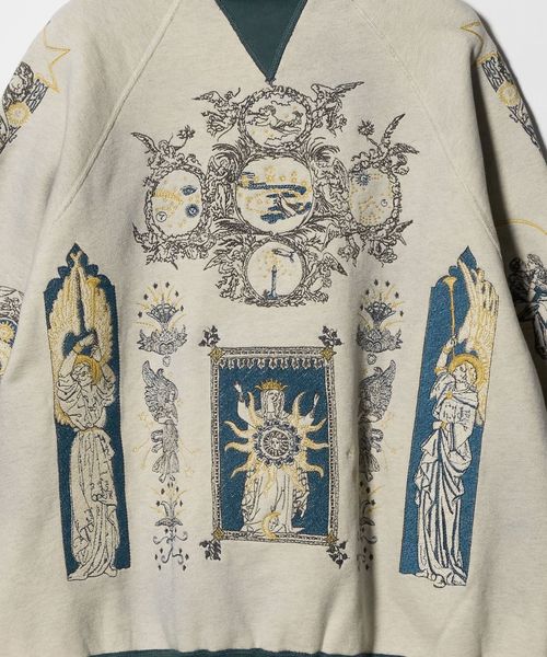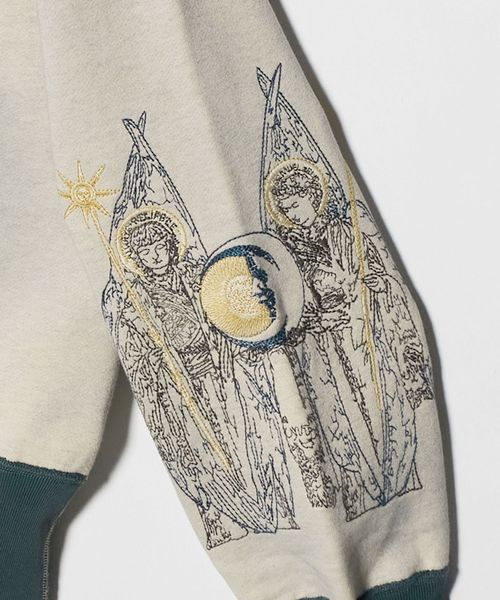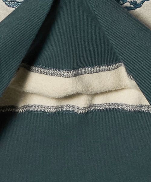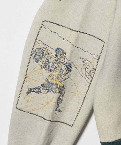 バイカラーデザインにオリジナルグラフィックの刺繍を贅沢に配した、クルーネックスウェットシャツ。