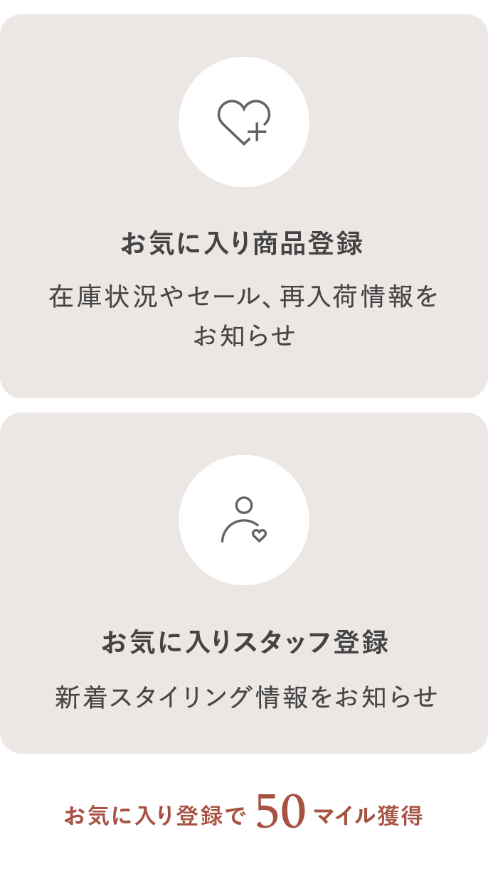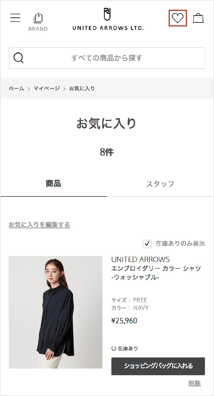 「お気に入り登録」とは、気になる商品やスタッフを「お気に入り」として登録できる、オンラインストアの機能です。