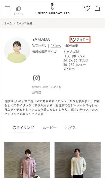 好みの合うスタッフをフォローすることで、毎日のコーデやお買い物の参考にしていただけます