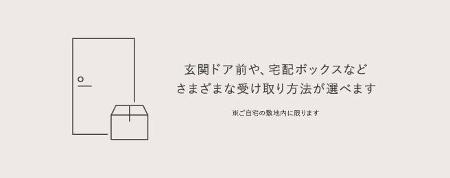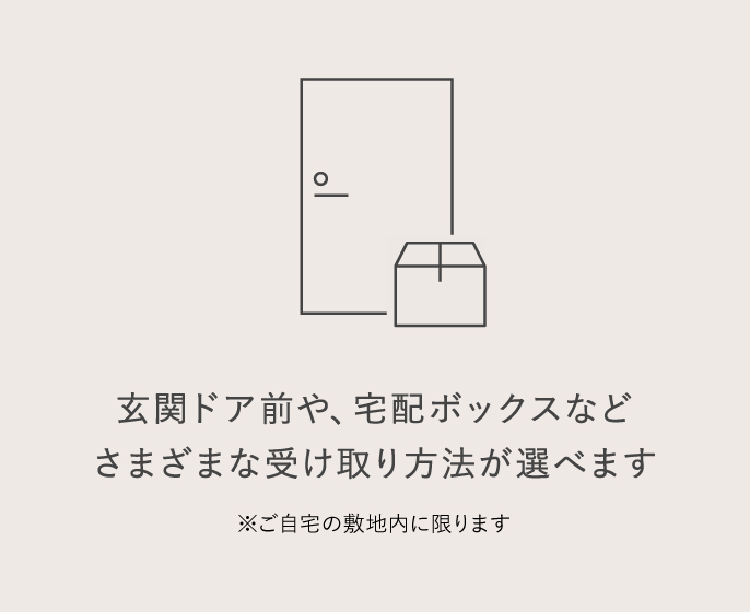 「置き配サービス」は、オンラインストアでご注文いただいた商品を在宅・不在に関わらず安心してお受け取りいただけるサービスです。