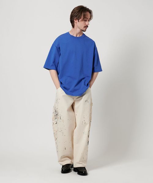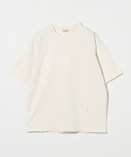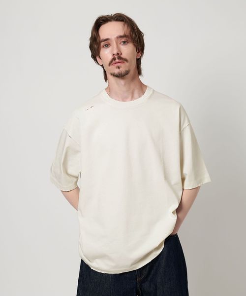 ダメージの入ったTシャツですが控え目な加工感なので、無地Tシャツ感覚で色々なボトムスとコーディネートいただけます。