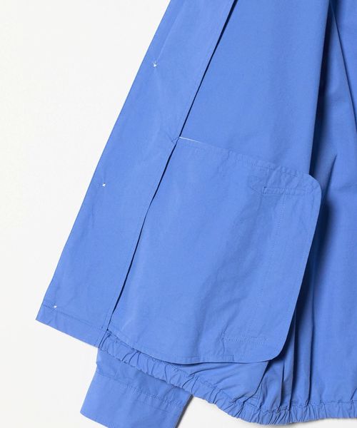 袖口のカフス仕様や大ぶりのボタンなど、シャツのムードをしっかり残しつつ、衿を大きくデザインし、箱ポケットや裾のシャーリング仕様などアウターのディテールをミックスしました。