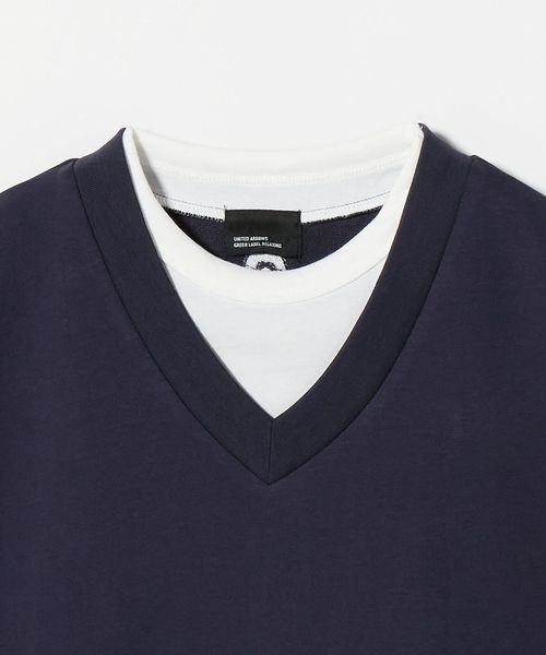 Vネックベストに袖と襟元、裾に天竺生地の別布をドッキングさせたフェイクレイヤード仕様です。