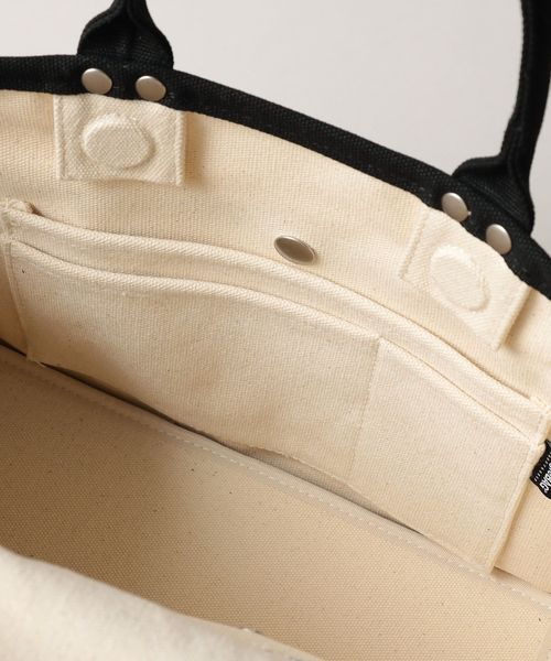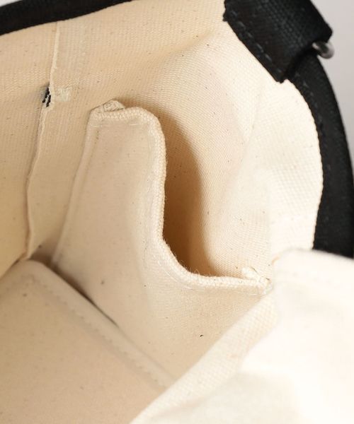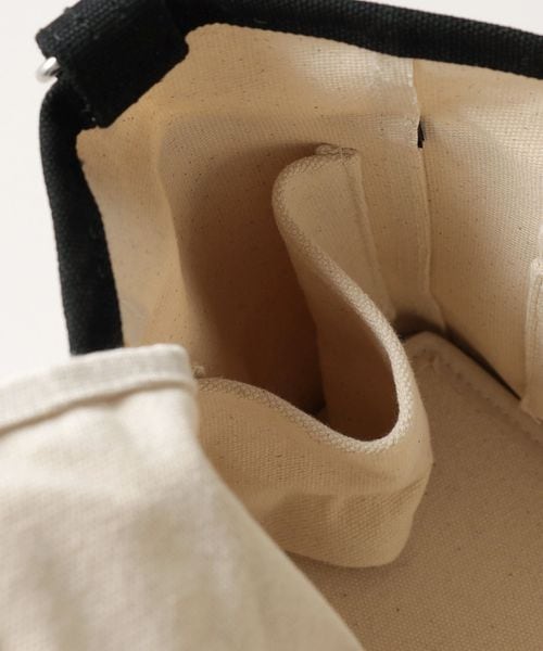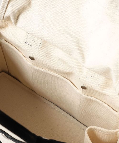 内側にペットボトルホルダーにもなるパーテーションと大小7つのポケット、外側に大小6つのポケット付き。