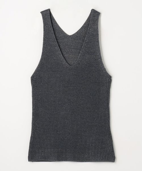 シャープな印象の深めのVネックで、ラメ糸をMIXした素材もフェミニンになりすぎずに着ていただけます。