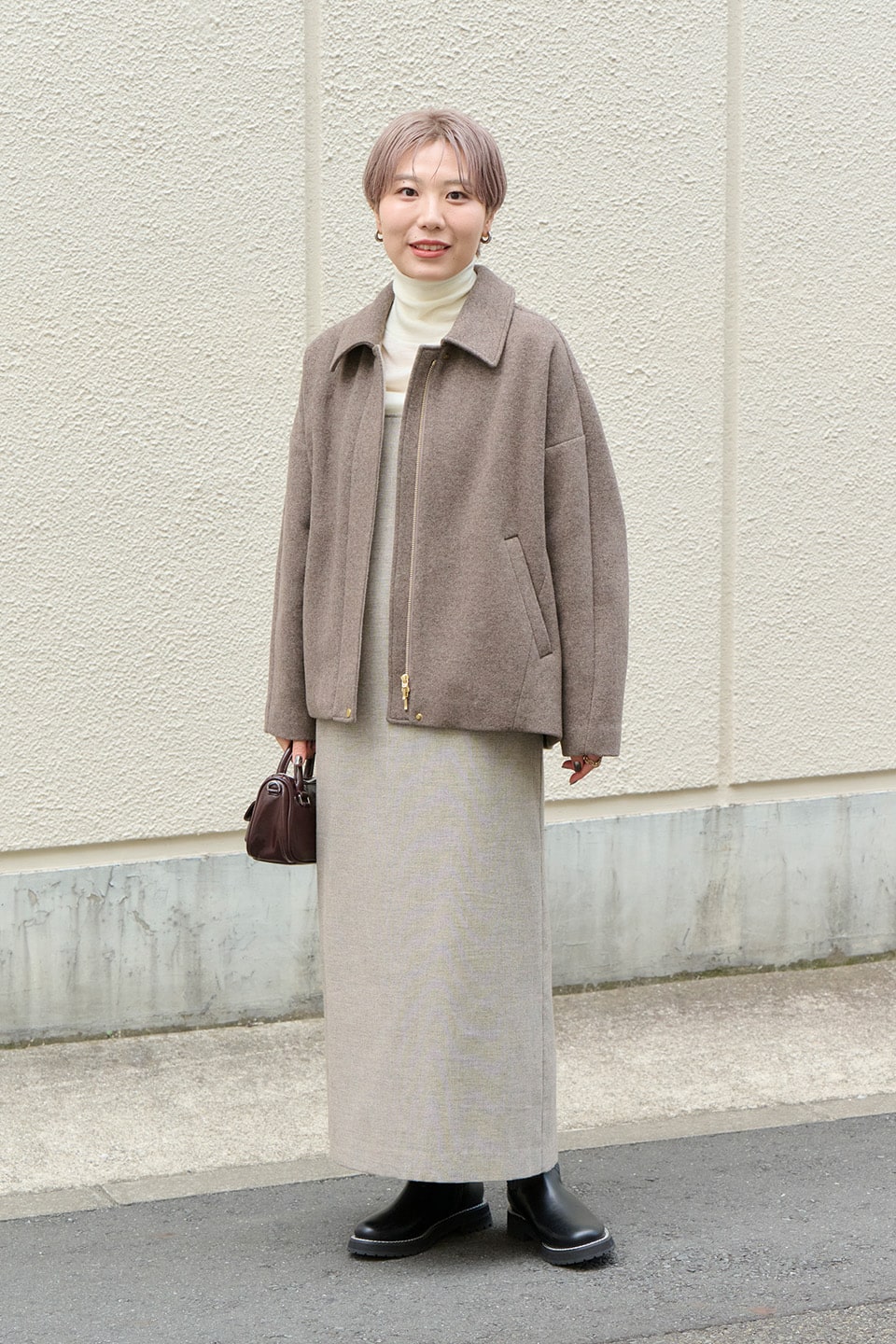 コーディネート。ショート丈のコートと