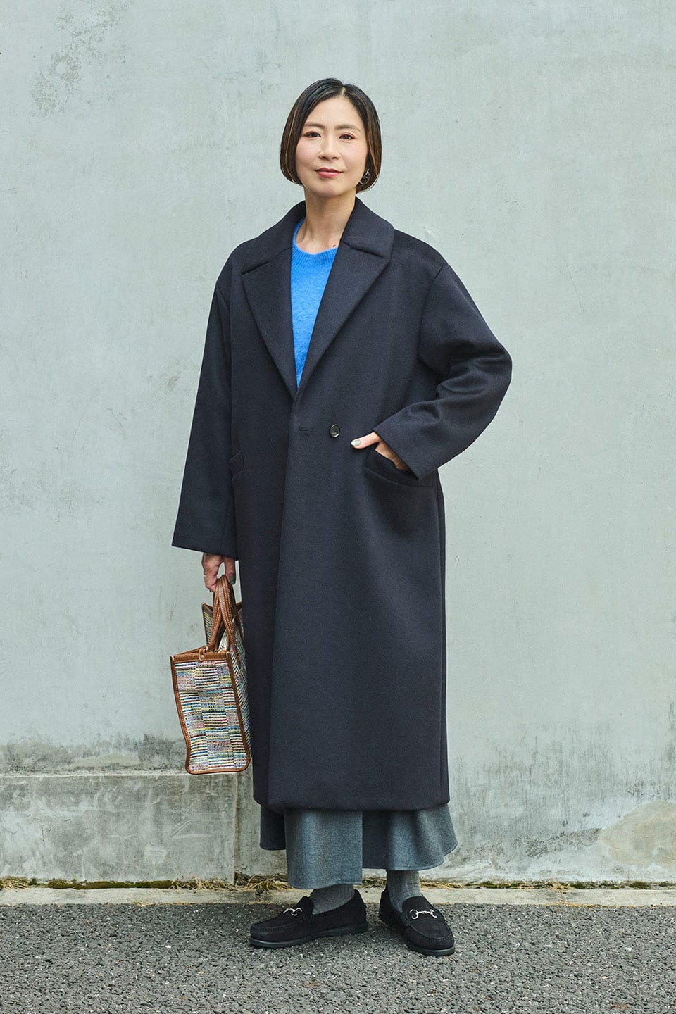 テーラードコートとローファーを