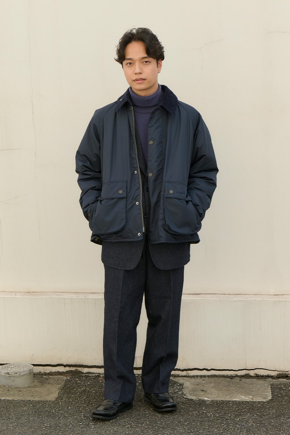 ネイビーのセットアップにジャケットを重ね、