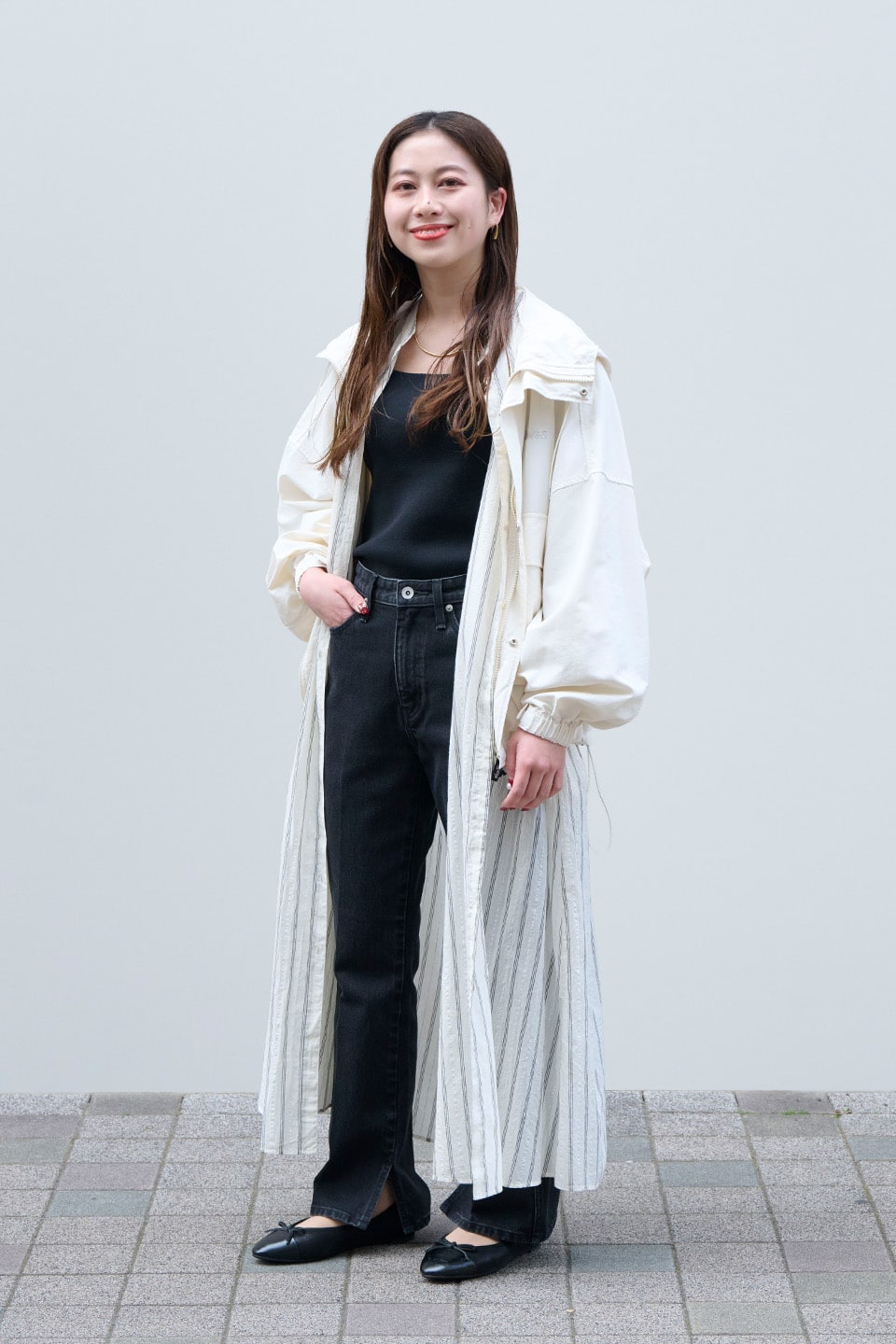 春らしいストライプシャツが映える、