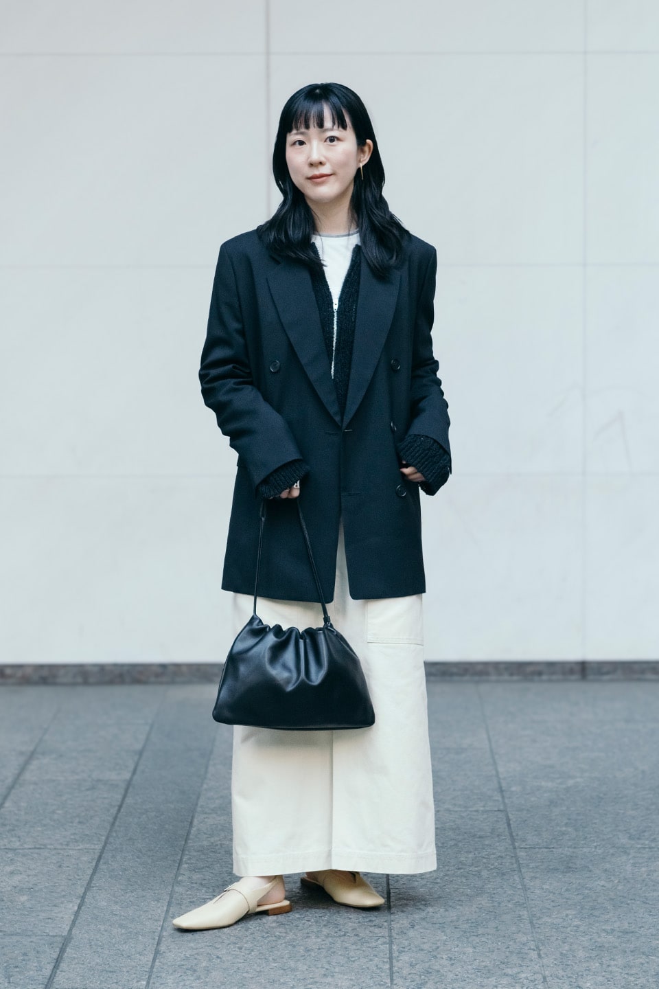 固くなりがちなブラックのジャケットスタイルも