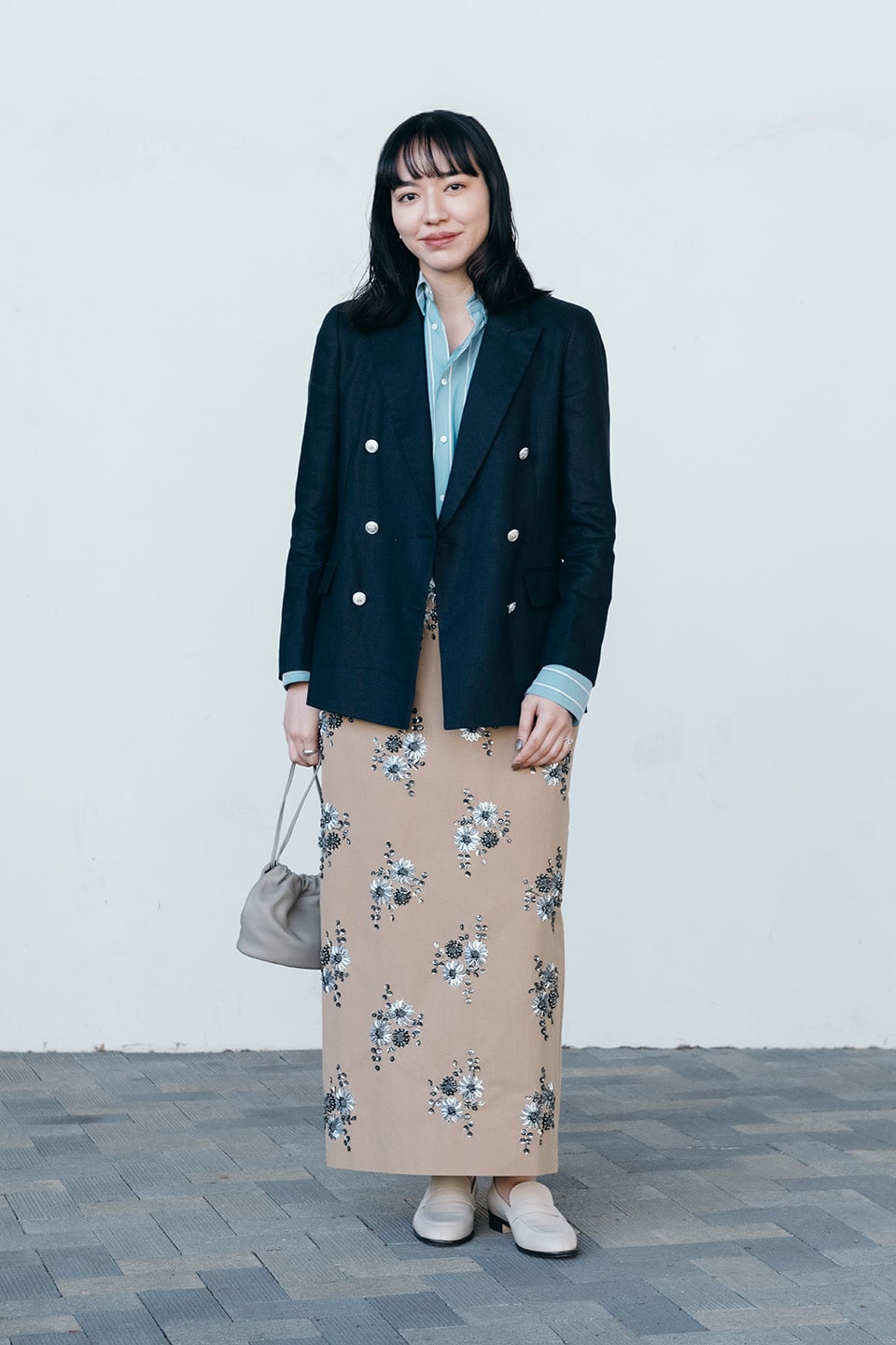 トップスにトレンドカラーのブルーを取り入れ、