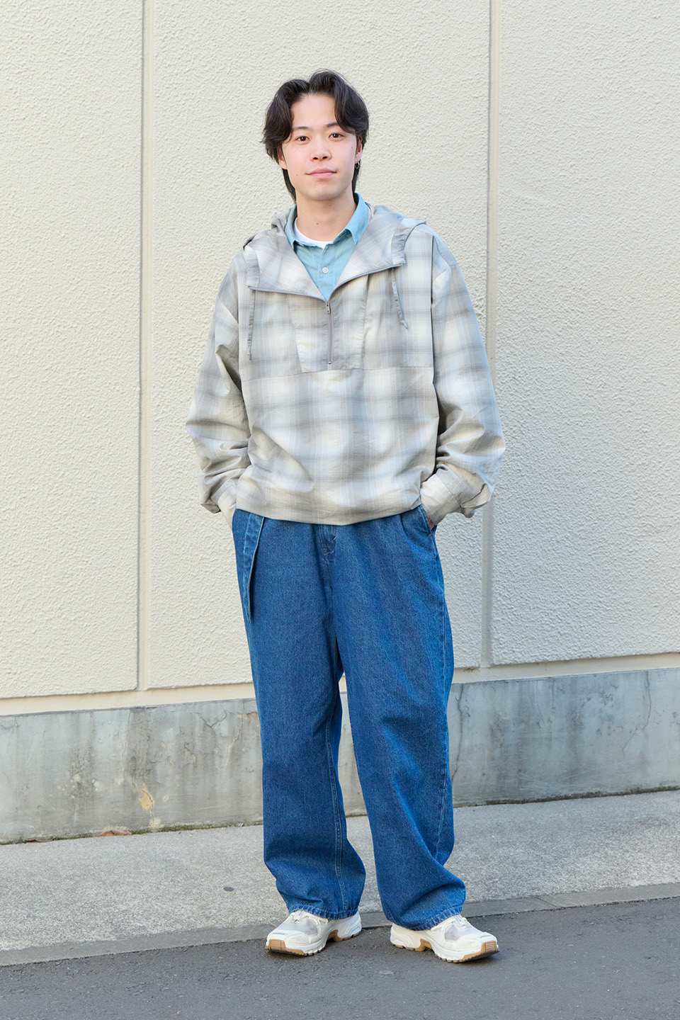 フーディーの下にデニムシャツを仕込み、今季