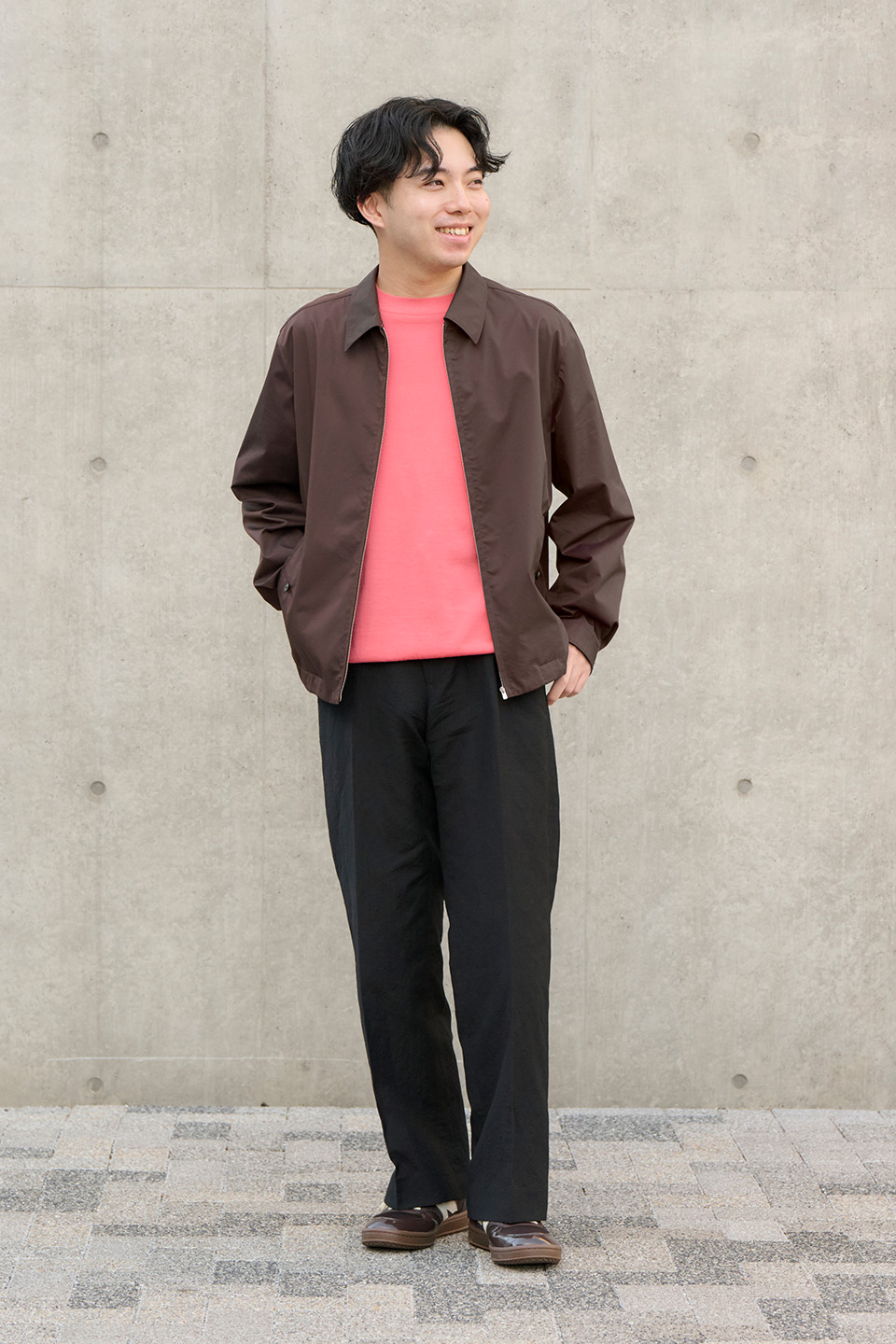 ジャケットとシューズの色をブラウンで