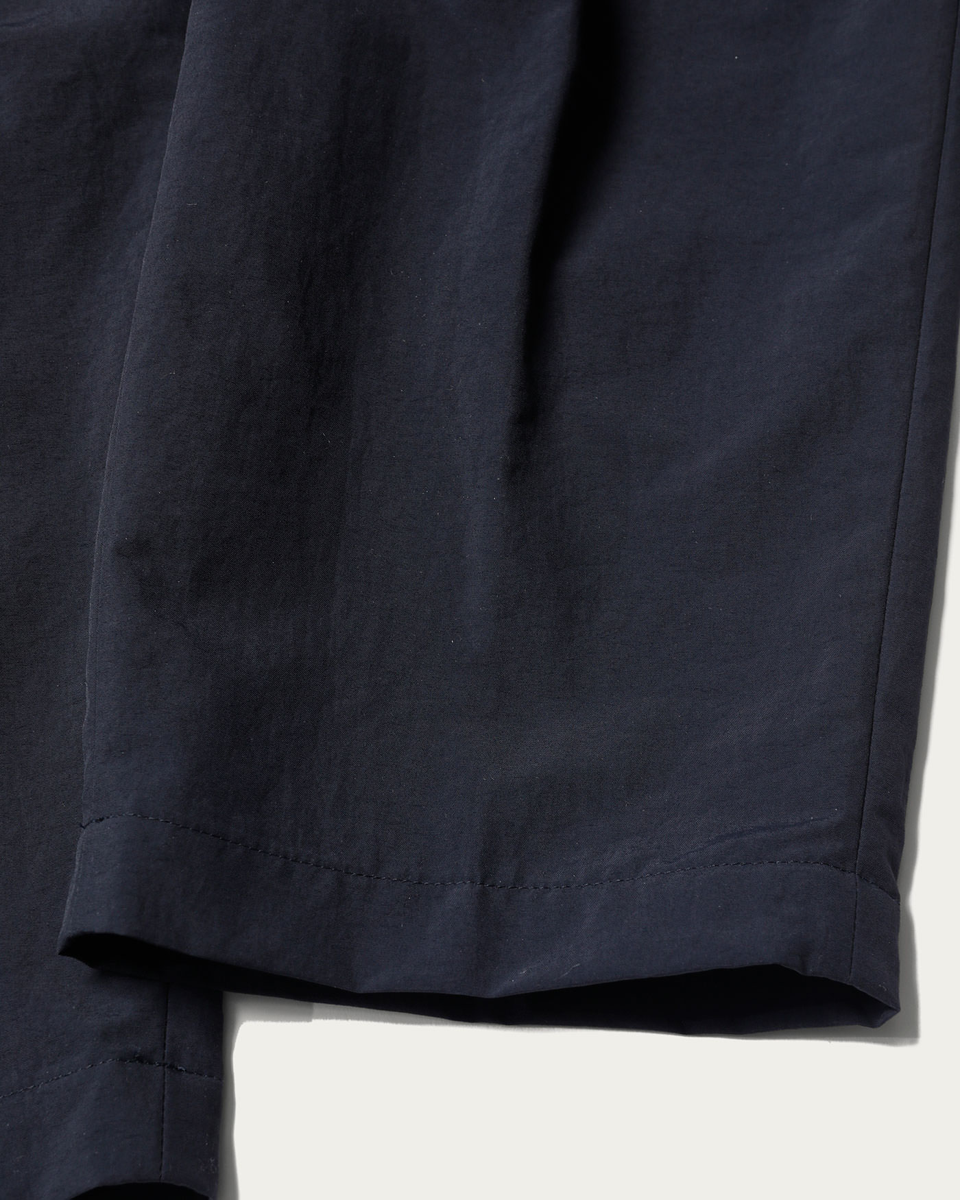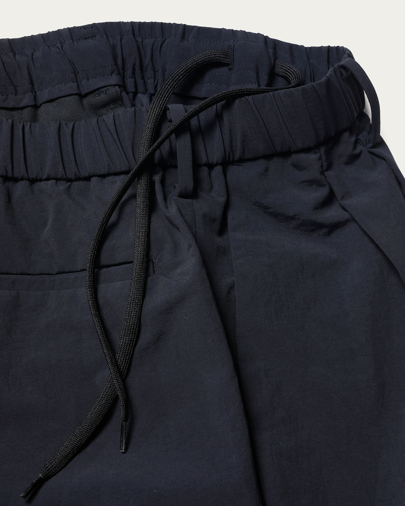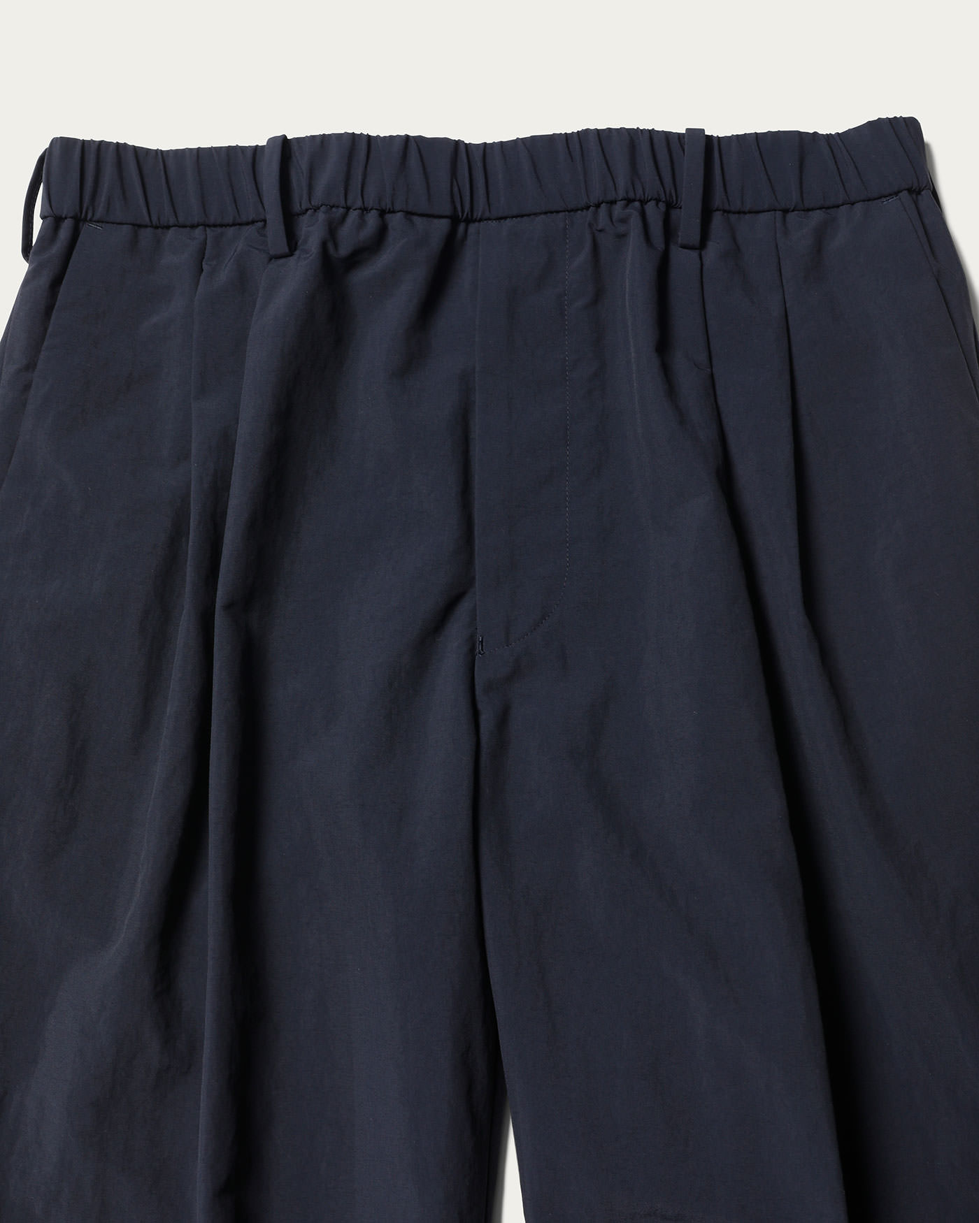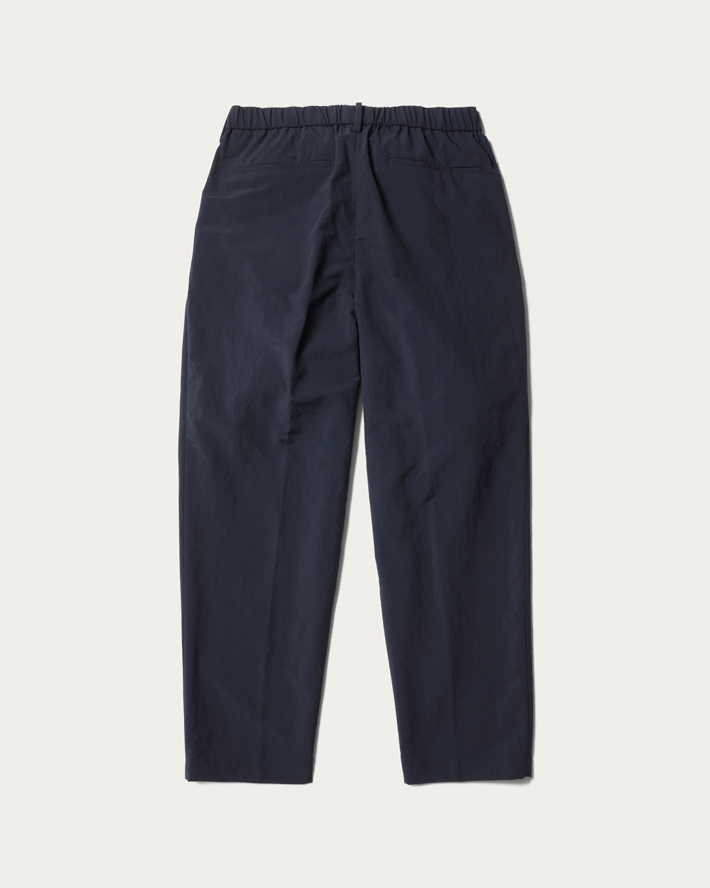 ドライタッチのナイロンウェザーを使用したイージーパンツ。2プリーツ入りのキレイ目シルエットでカジュアル過ぎない印象です。