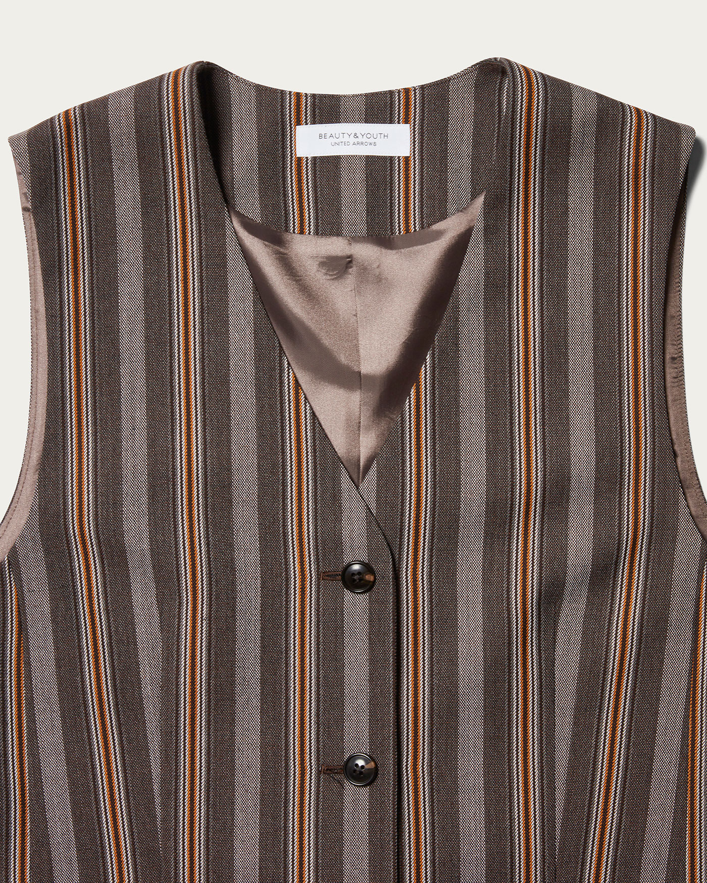 今シーズンもトレンドアイテムのひとつであるベストを先染め生地により、メンズ要素を取り入れお作りしました。ストライプ生地はオリジナルで作った素材です。アームホールをやや大きめにしているので、ボリュームのあるシャツやカットソーにも合わせていただけます。
