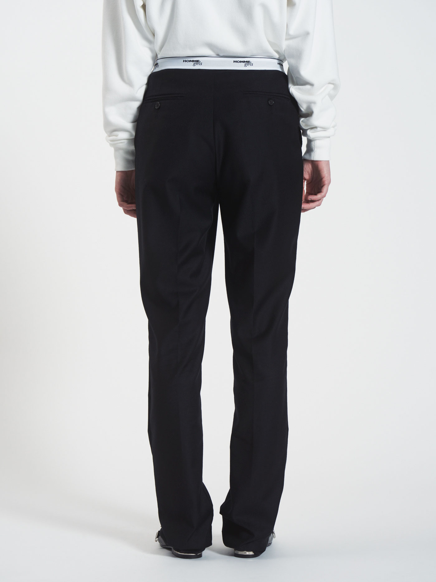 ウエストのエラスティックがポイントになるマニッシュなパンツ。ジャケットとセットアップでの着用も非常におすすめです。腰履きでルーズに履いていただくのも、このパンツの”らしさ”が出る一着です。