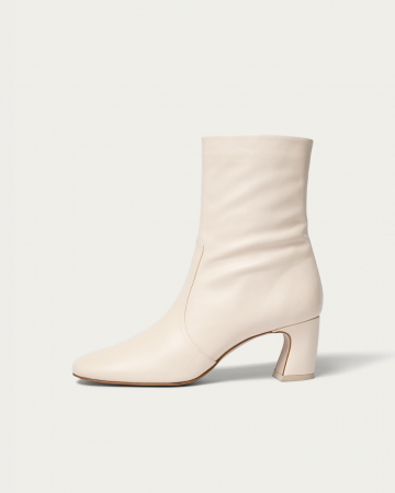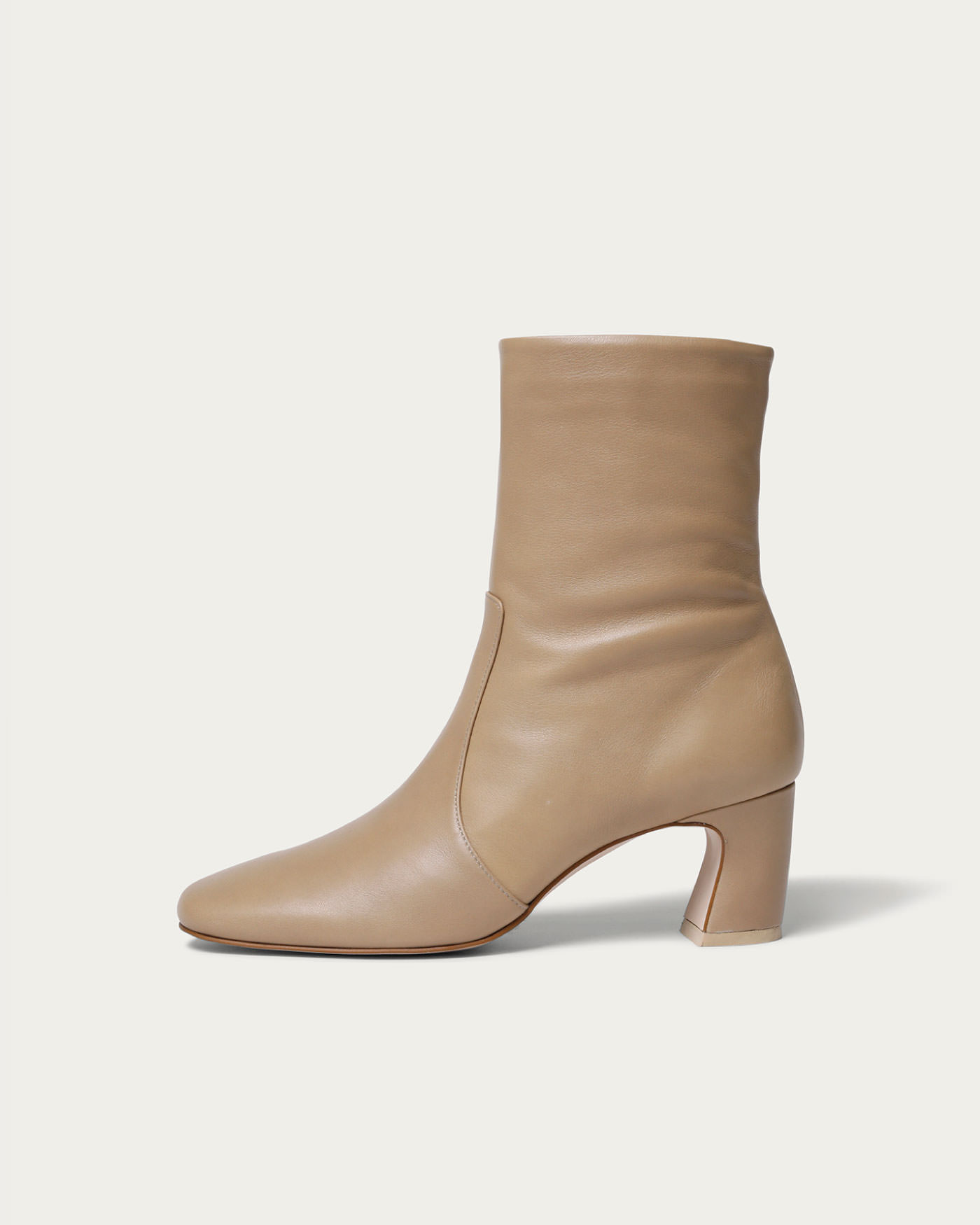 シンプルながら細部までこだわりの詰まったショートブーツです。細めの筒周りはフィット感のある素材でソフトな足当たり。歩行時にも圧迫感のない快適な履き心地が嬉しいポイントです。丸すぎず、ややスクエアのトゥ先できれいめな印象の一足はくびれたような変形ヒールを組み合わせ、エッジの効いたシルエットが魅力的です。丈は少し長めに設定し、様々なボトムスと合わせやすくしているのもポイントです。