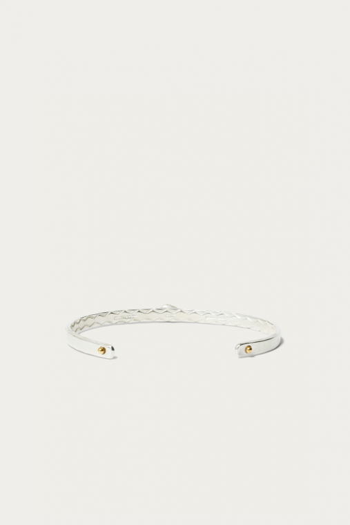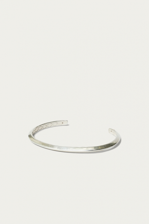 伝統的なインディアンジュエリーから着想を得るも、繊細なカッティングとモダンなスタンプワークで〈BEAUTY&YOUTH〉らしいモダンな印象へ仕上げたシルバーバングルです。裏に取り付けられた真鍮パーツはゴールドがさり気ないアクセントになっている。華奢なデザインなので重ね付けや腕が細い方、女性にもお勧めなアクセサリーです。