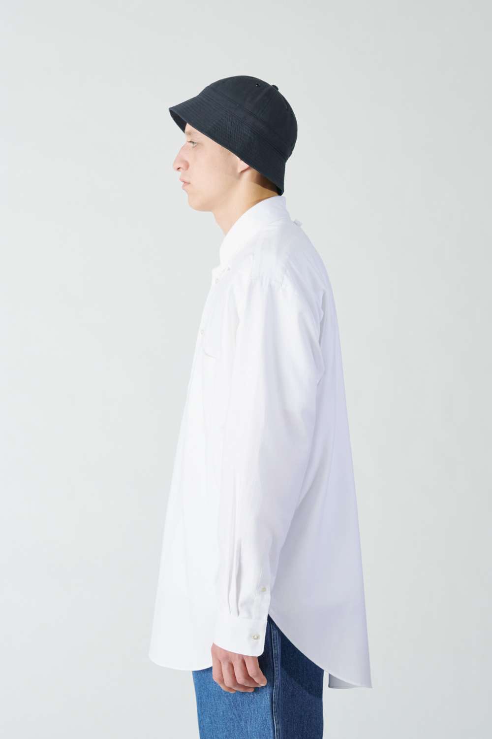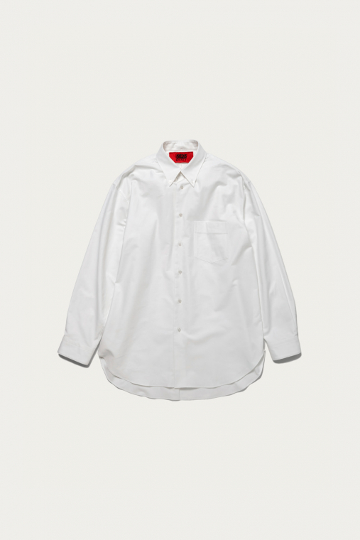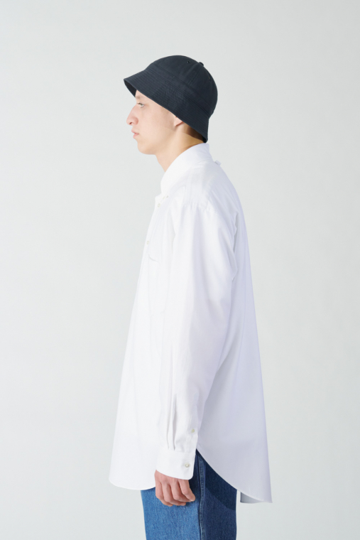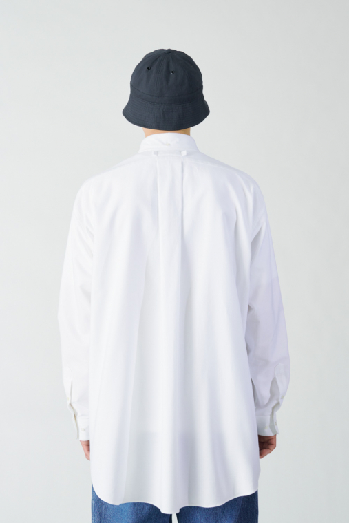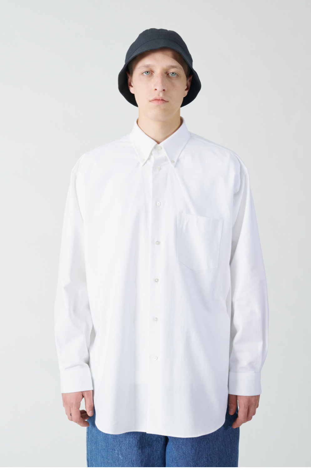 旬な着こなしにマッチする、潔いビッグシルエットのオックスフォードシャツはコンセプチュアルなコラボを通して日本のモノづくりにフォーカスする気鋭ブランド、〈5525gallery〉と共同で製作したもの。フラットなボタンやネック後ろのハンガーループ、太めのタックなど、随所に意図的に加えた違和感が新鮮さの理由。