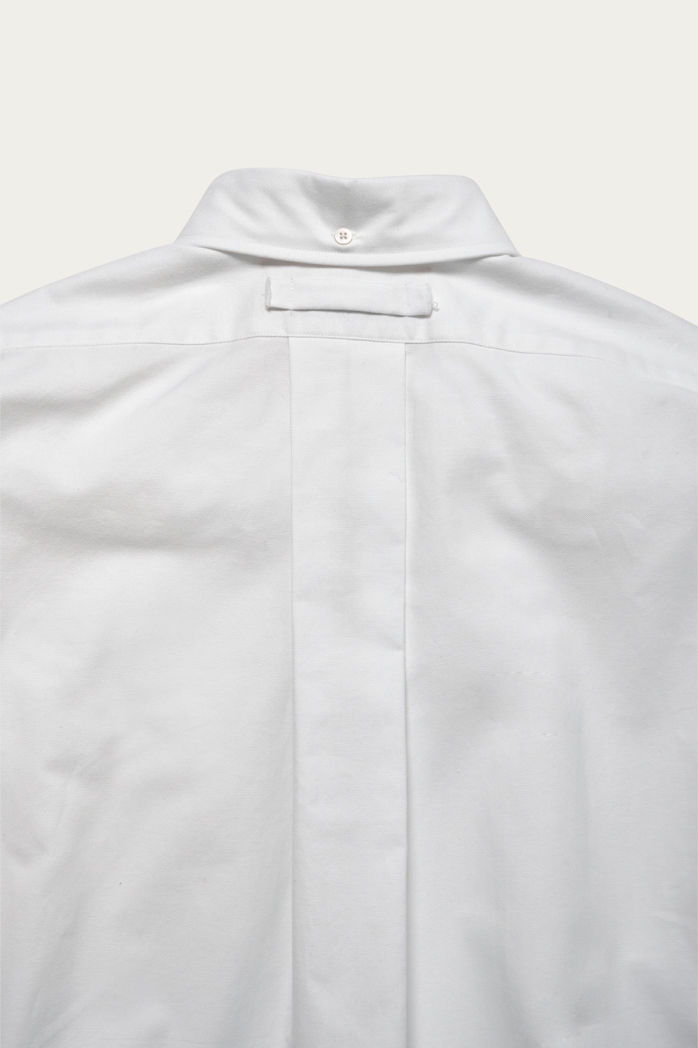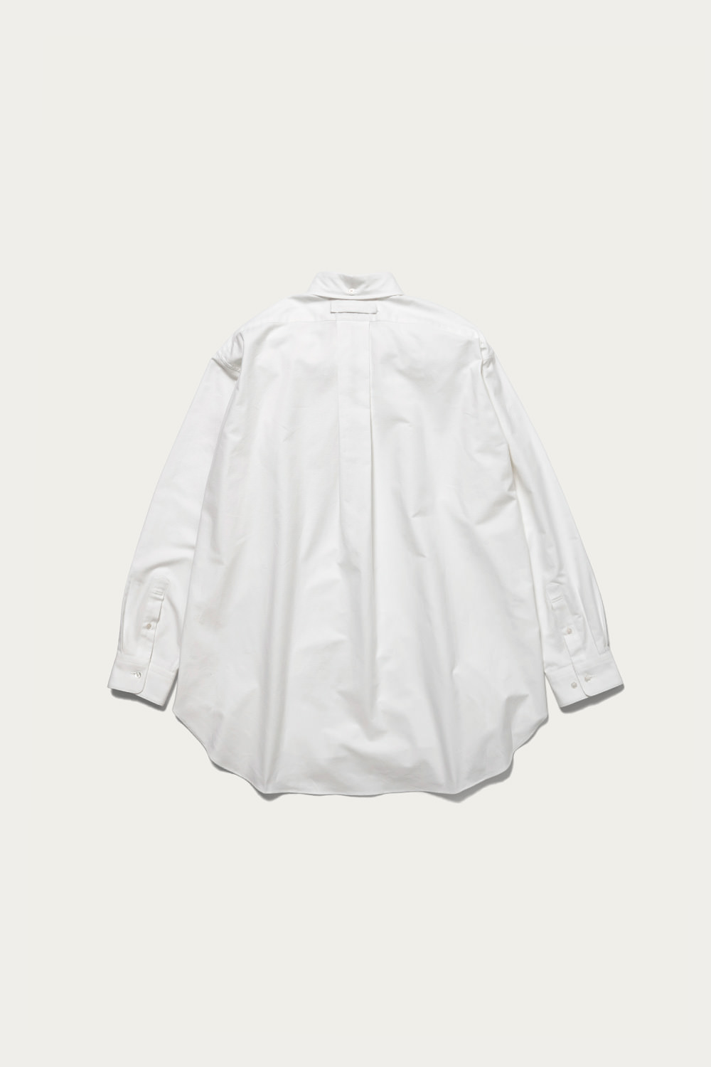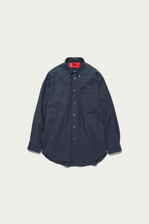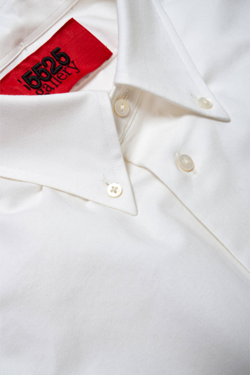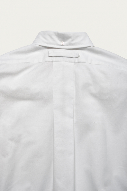 旬な着こなしにマッチする、潔いビッグシルエットのオックスフォードシャツはコンセプチュアルなコラボを通して日本のモノづくりにフォーカスする気鋭ブランド、〈5525gallery〉と共同で製作したもの。フラットなボタンやネック後ろのハンガーループ、太めのタックなど、随所に意図的に加えた違和感が新鮮さの理由。