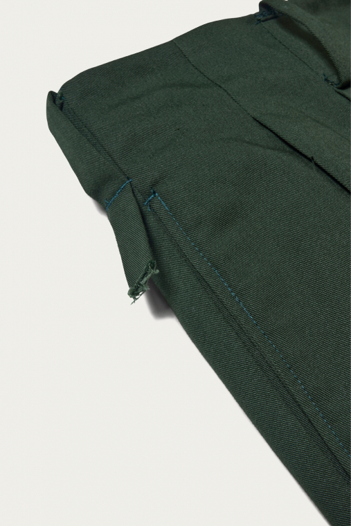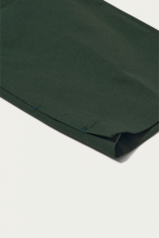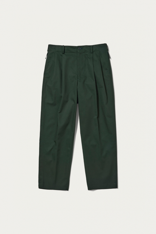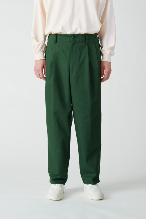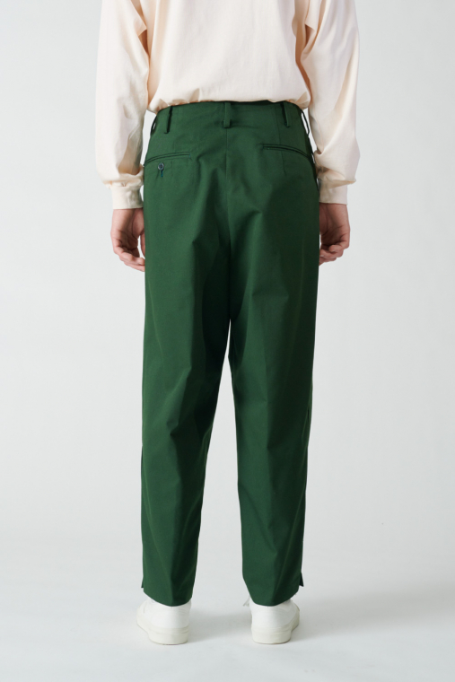 2タックのワイドシルエットながら、実際に穿くとスッキリ品よく見えるパターンは、〈5525gallery〉独自のもの。ステッチ留めのサイドスリットを設けた裾や、下端が切りっぱなしになったベルトループなど、シンプルに見えてギミックも満載。薄着になっていくこれからの季節には特に映える、遊び心たっぷりのチノパンです。
