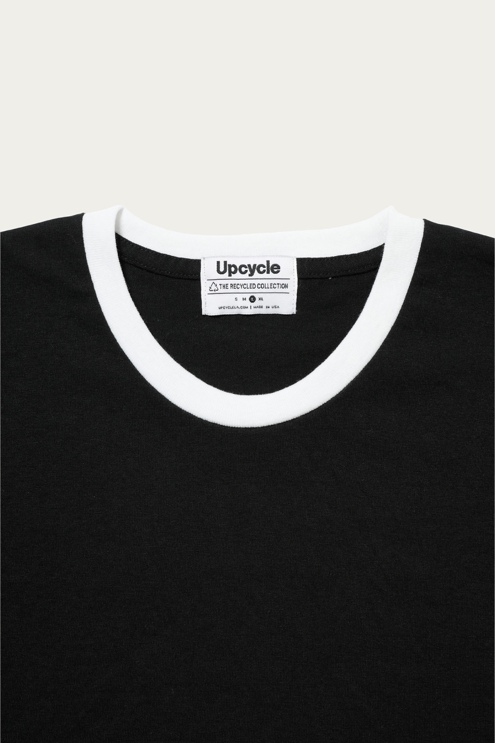 〈UPCYCLE〉はリサイクルTシャツを中心とした商品展開で始まった米国ブランド。製造工程で生じる生地のロスや廃棄などを最小限に留めたものづくりを徹底していて、このリンガーTはリサイクルコットンとペットボトルから再生されたポリエステル繊維でできています。〈BEAUTY&YOUTH〉ではシックなモノトーンで別注しました。