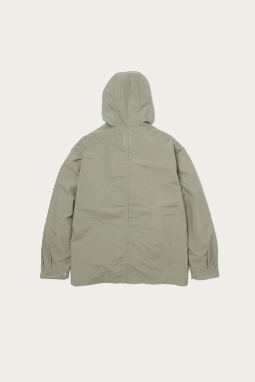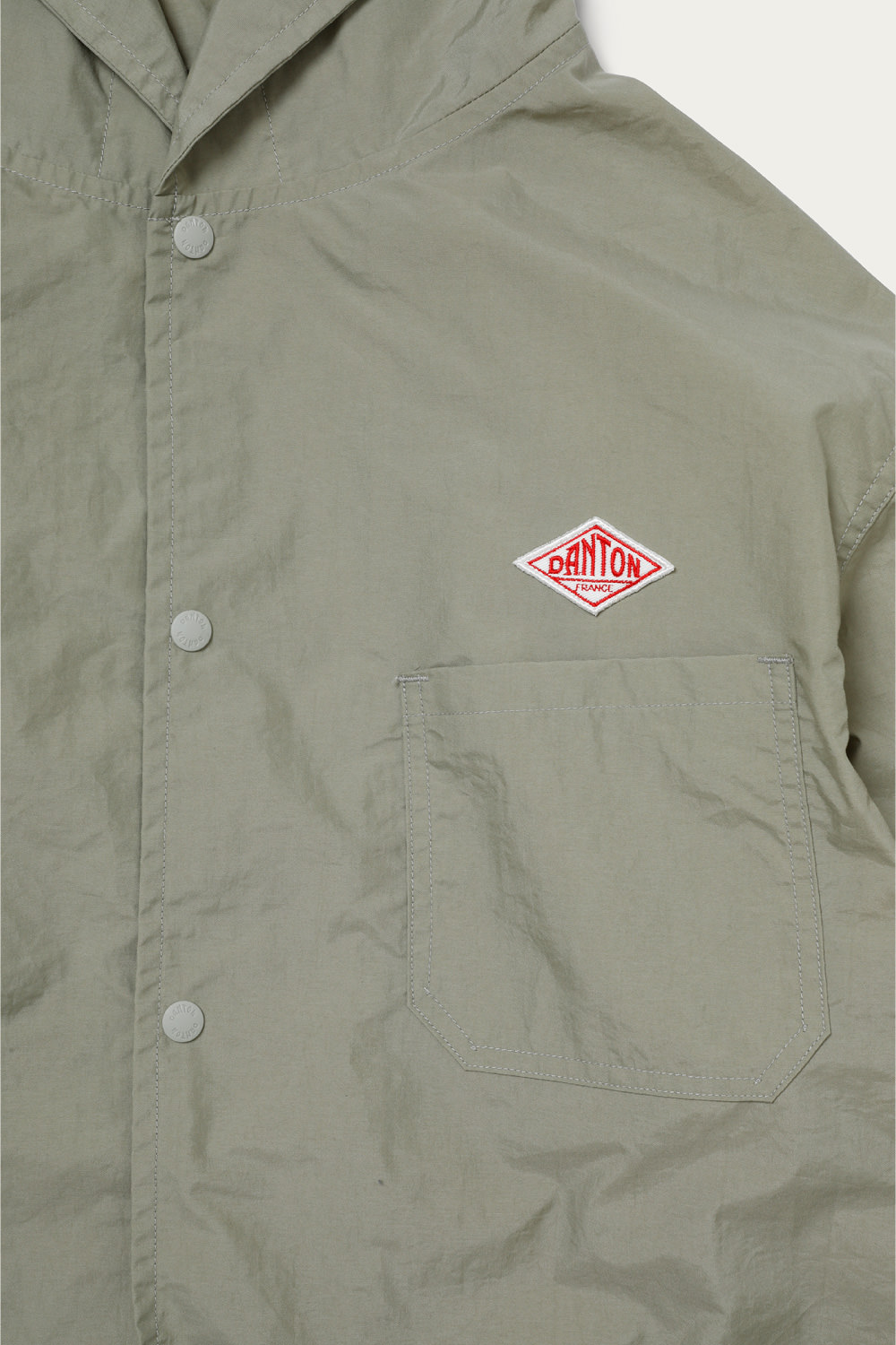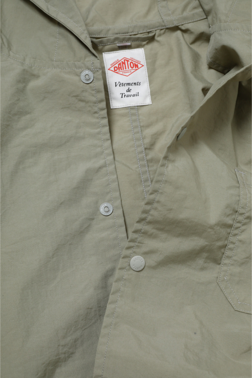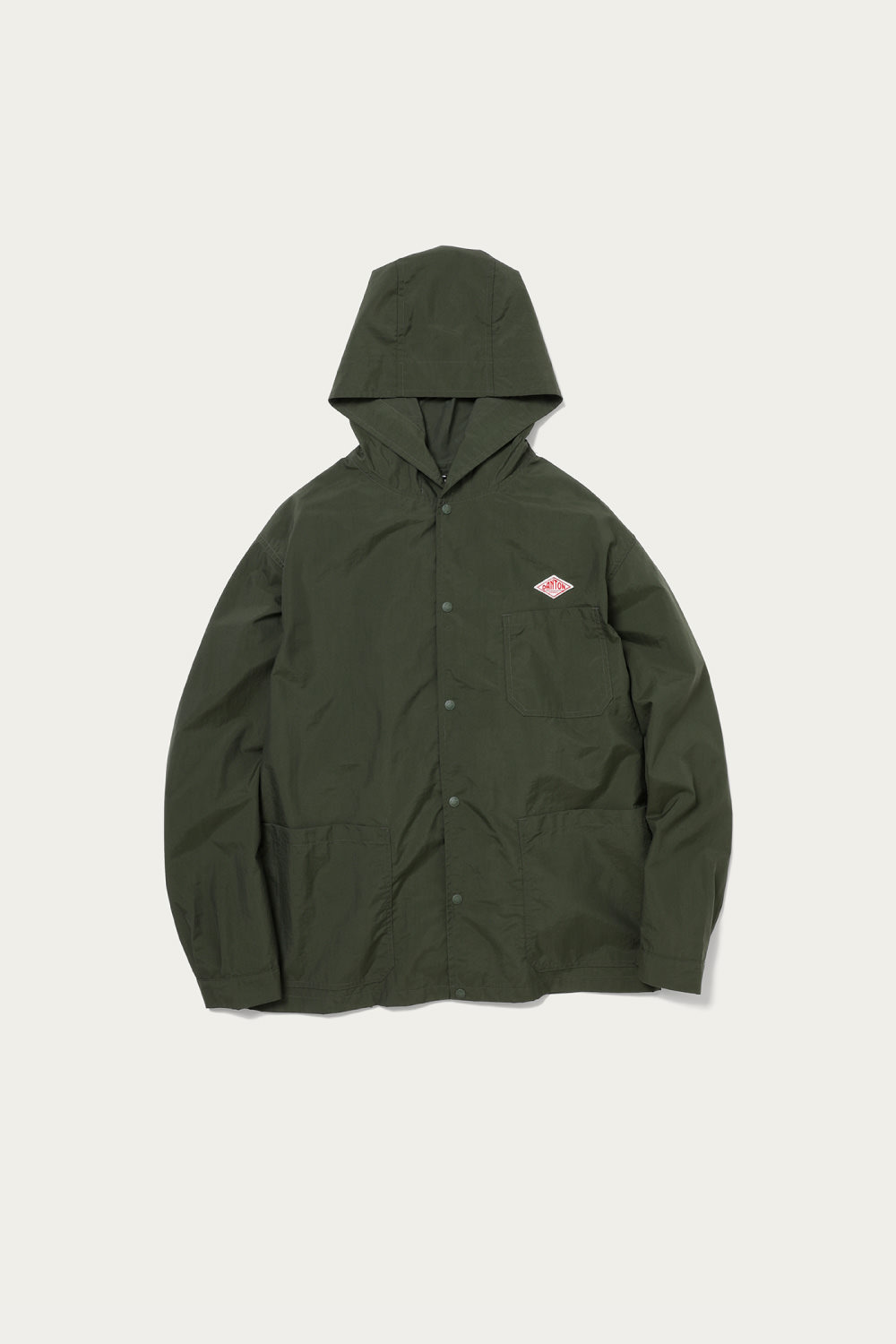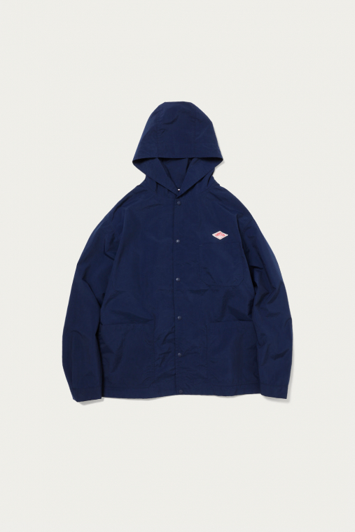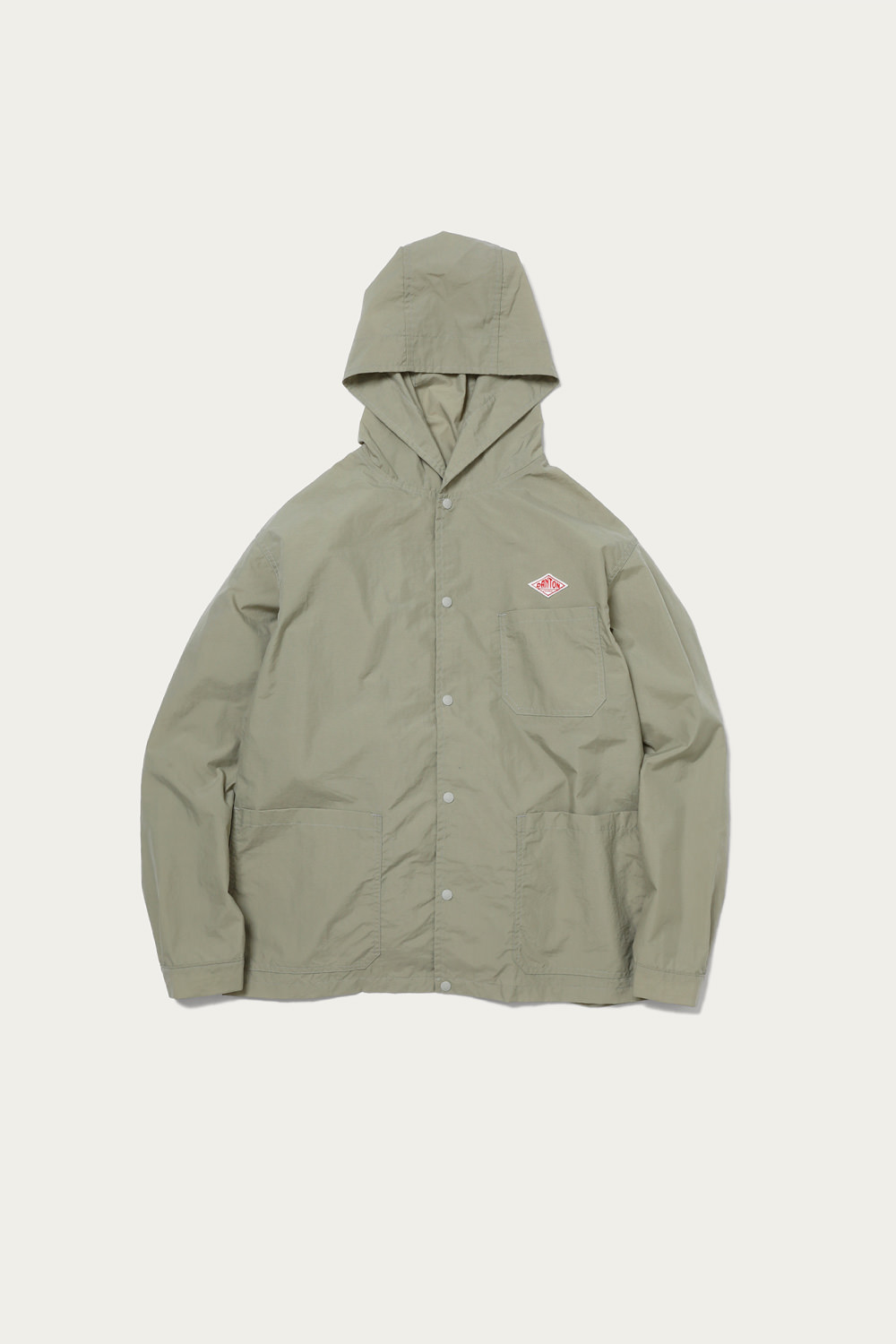 カバーオールはワークウェアづくりが出自の〈DANTON〉を象徴するアイテムのひとつ。そんな定番をベースにフードをあしらい、生地をやや薄手のナイロンに変更することでシャツのように気軽に羽織れる、春先に最適なアウターができました。パーカのように、より重いアウターの中に着込んでフードを出しても映える1着です。