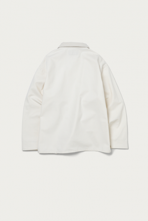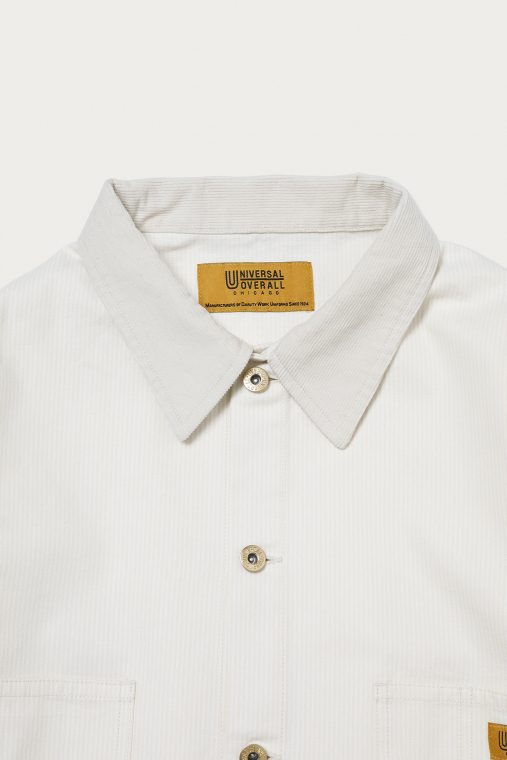 恒例となっている、〈UNIVERSAL OVERALL〉への別注の最新作。ベースモデルは従来同様のカバーオールですが、今季は珍しいベージュやチャコールといったカラーのヒッコリー生地を使い、骨太さと品の良さが両方漂うデザインに。襟元はコーデュロイで切り替えていて、畝とボディのストライプとの絶妙なミスマッチはが洒落っ気を醸しています。