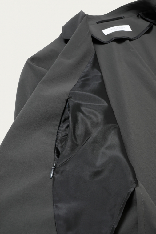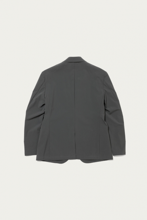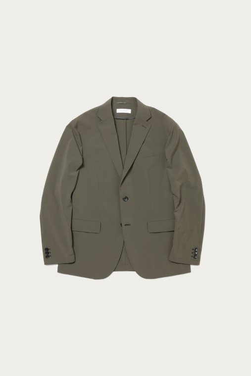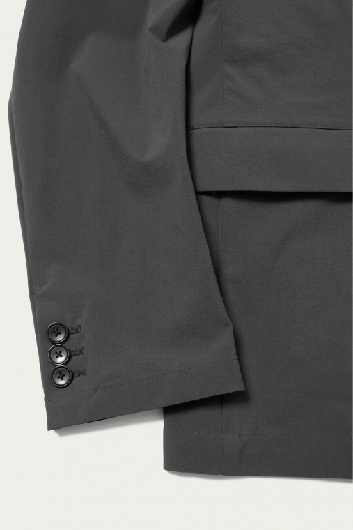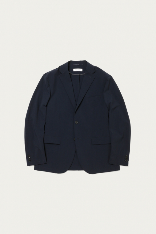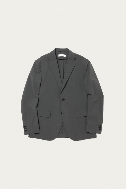 同素材のスラックスとともに製作した、ナイロンの2Bジャケット。撥水性を備えた機能的な生地ながら、マットで膨らみのある質感はスポーティすぎず、きれいめな装いに自然にマッチします。スマートなシルエットですが、生地自体に伸縮性があるため窮屈さが無く、動きやすいのが特長です。セットアップで、単体でと活用の幅が広いのも魅力的。
