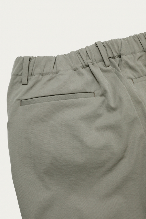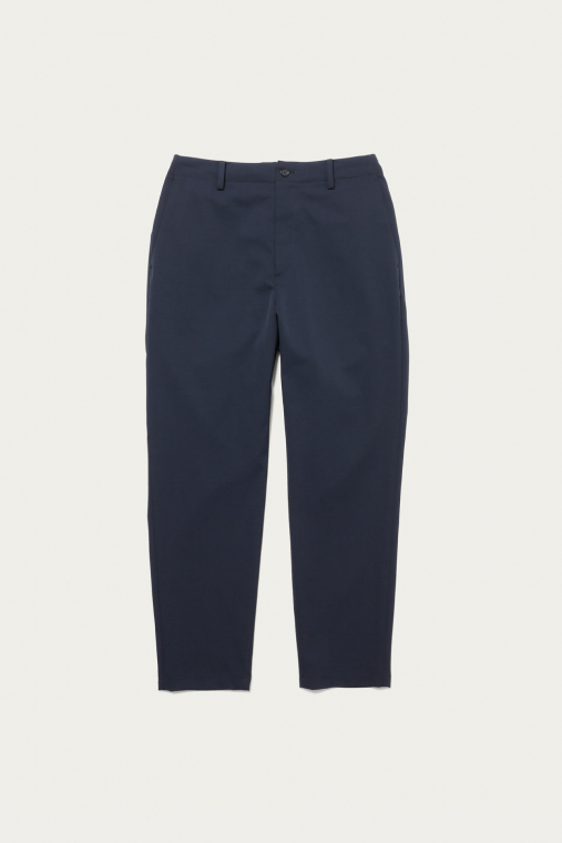 端正な化繊の質感の中に綿麻のナチュラルなムラ感が覗く、独特の生地で仕立てたトラウザーズ。肌離れが良く、汗をかいてもベタつきにくいので夏場でも快適さが続きます。ウエストにはドローコードとバックシャーリングをあしらっていて、ベルトは有り無しどちらでも穿ける仕様です。腰回りにゆとりを持たせた、現代的な1本。